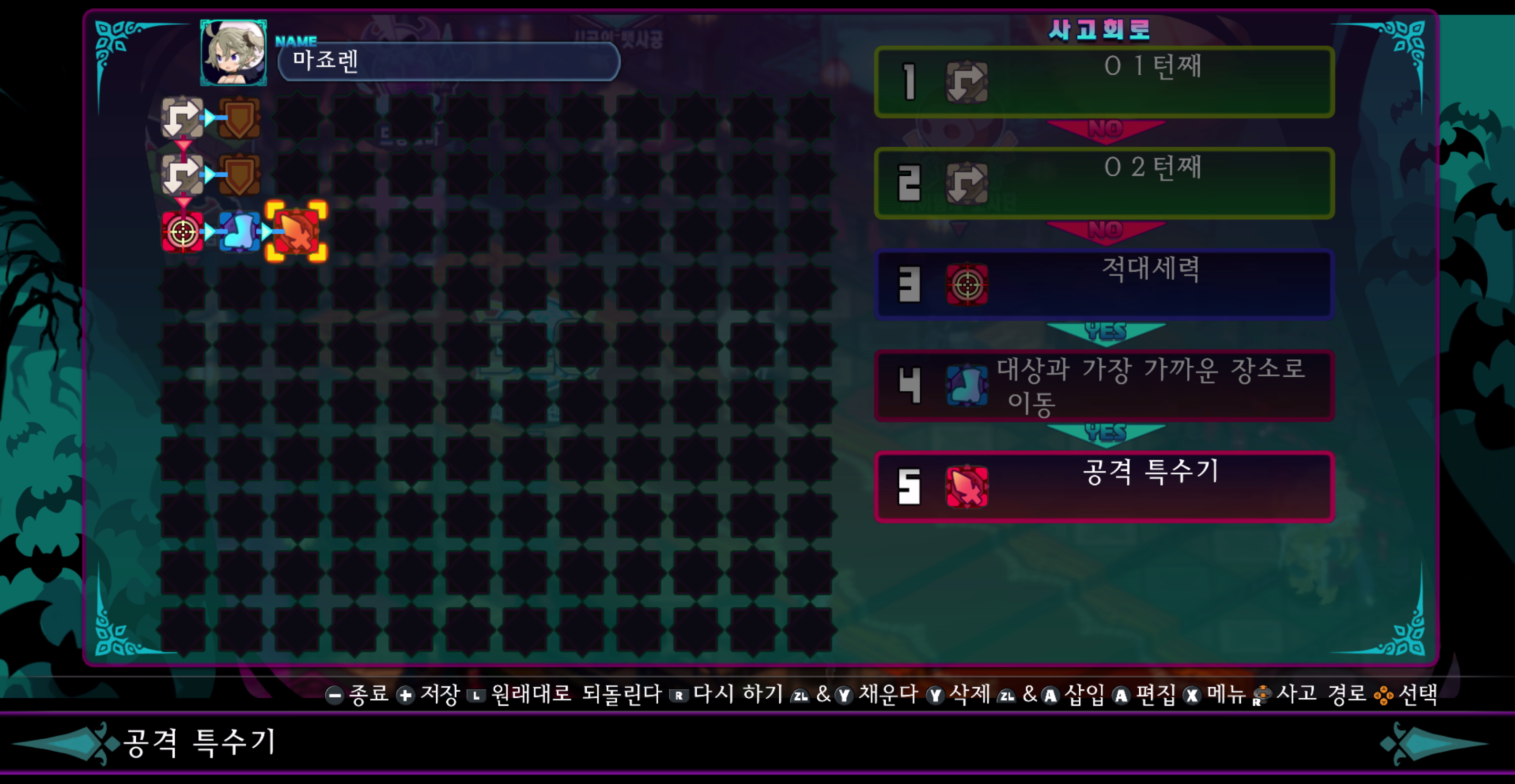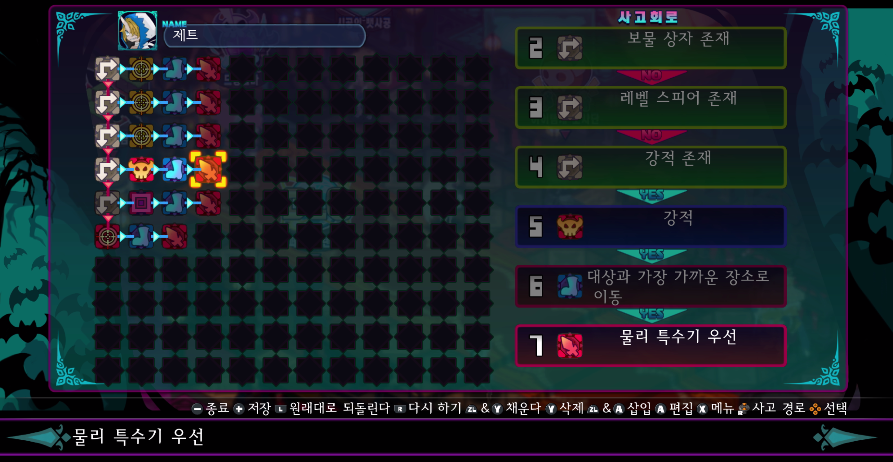이노센트 > 보물 상자 > 레벨 스피어 > 강적 > 스킵 게이트 순서대로 검색하며 대상이 있으면 다가가서 물리 특수기를 사용하는 단순한 로직. 주로 끝없이 아이템계를 내려가고자 할때 사용.