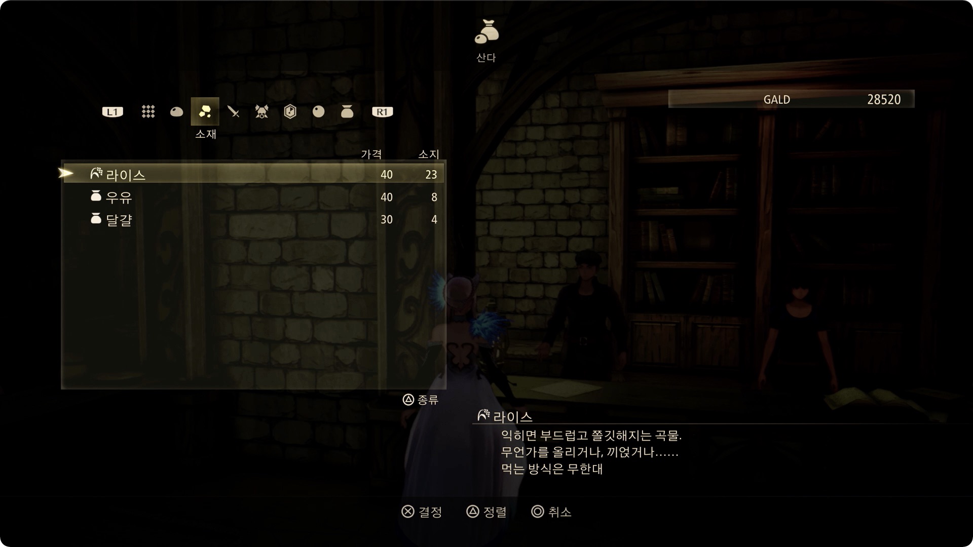 두부 : 가나스하로스의 '페레기온' 또는 '티스빔'의 숙소에 있는 잡화상에게 구매 가능하다. (개당 50 GALD)