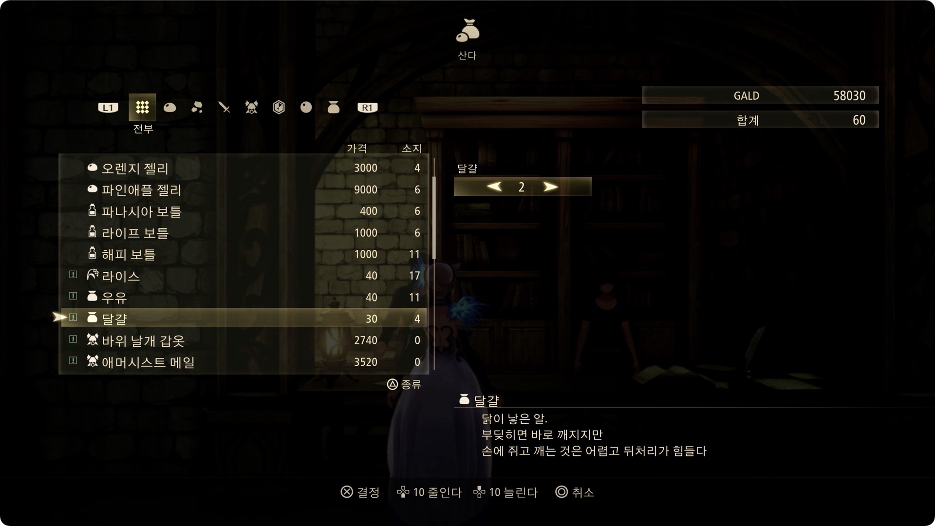 달걀은 시스로디아, 미하그살, 가나스하로스 지방 잡화점이나, 만물상에서 쉽게 구매할 수 있습니다 (개당 30 GALD)