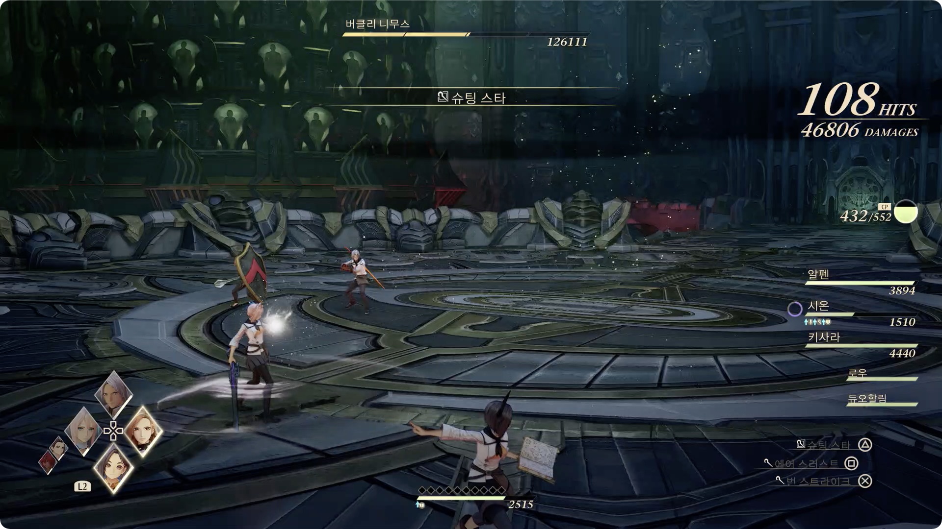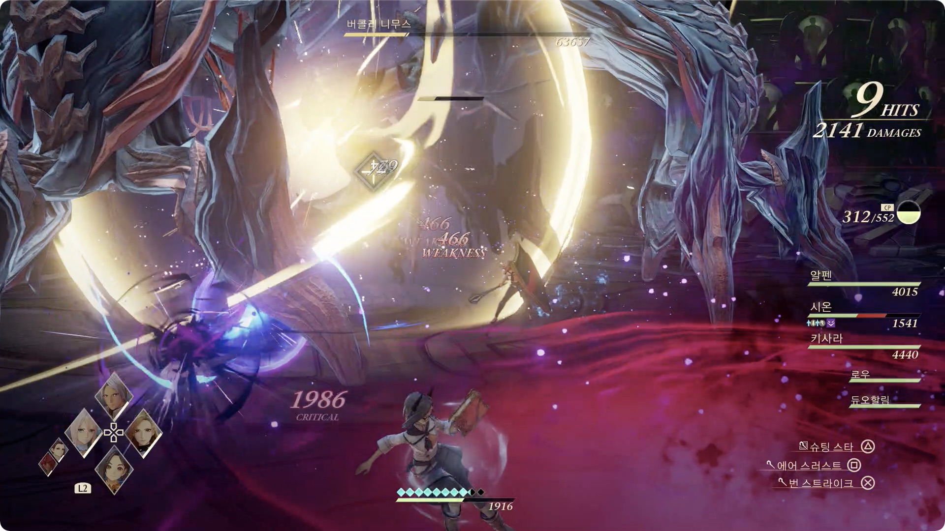 점프후 내려찍으면서 광범위한 범위의 공격을 하는데 제자리 점프로는 피할수 없고, 타이밍 맞춰 버스트 어택으로 끊어주던지 피하던지 해야합니다. 주변에 그림자를 통해 어느정도 타이밍을 예측할 수 있습니다.