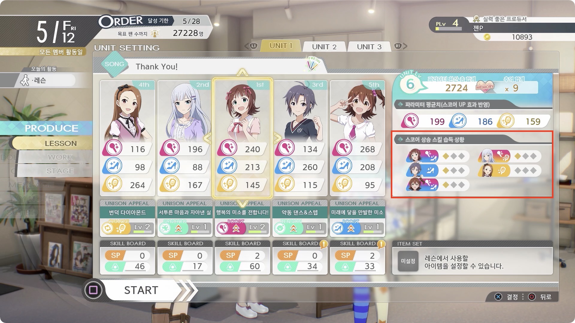 아이돌 별로 '스코어 상승 스킬 습득 상황'을 통해 어떤 레슨을 하면 많은 파라메터가 올라가는지 미리 대략적으로 알 수 있어 이것을 참고로 레슨을 하면 되는데...