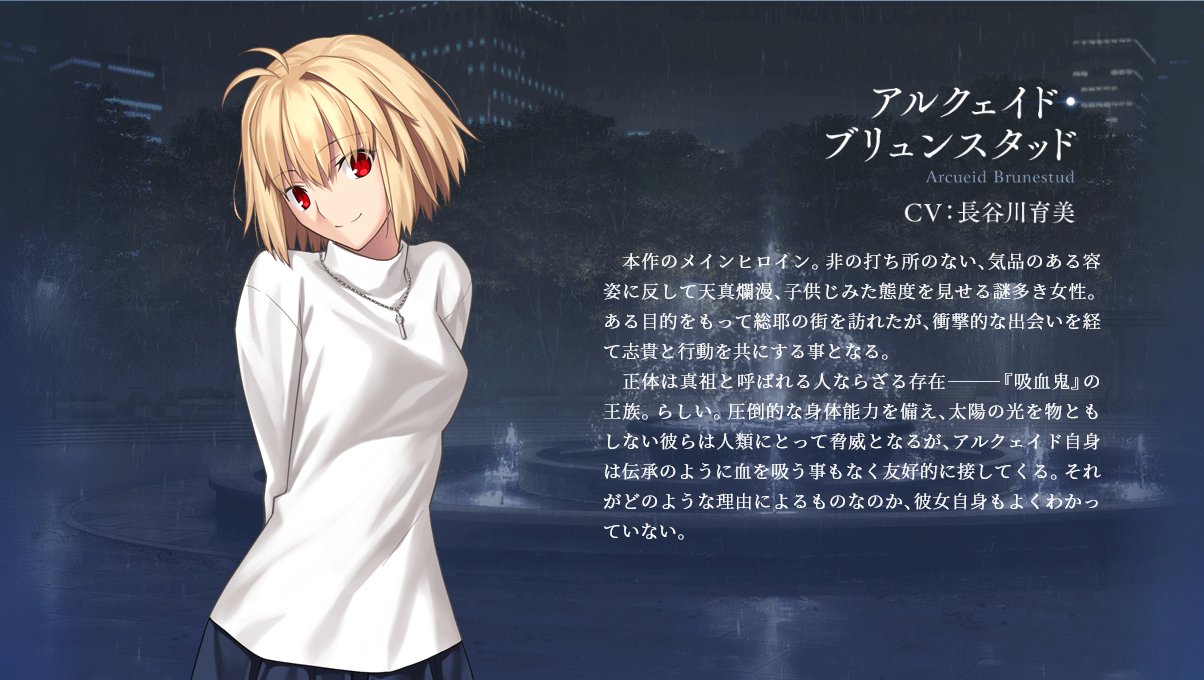 | 본작의 메인 히로인. 흠잡을 데 없는 기품있는 용모에 비해 천진난만한 어린이같은 태도의 수수께끼 많은 여성. 어떠한 목적을 가지고 소우야의 거리를 찾아갔다가, 충격적인 만남을 통해 시키와 같이 행동하게 되었다. 정체는 진조라 불리는 사람이 아닌 존재─── 「흡혈귀」의 왕족인 듯하다. 압도적인 신체능력을 가지고 태양빛을 아랑곳하지 않는 그들은 인류에게 위협적이지만, 알퀘이드 자신은 전승처럼 피를 빨지도 않고 우호적으로 대한다. 그것이 어떤 이유에서인지 그녀 자신도 잘 모르고 있다. |