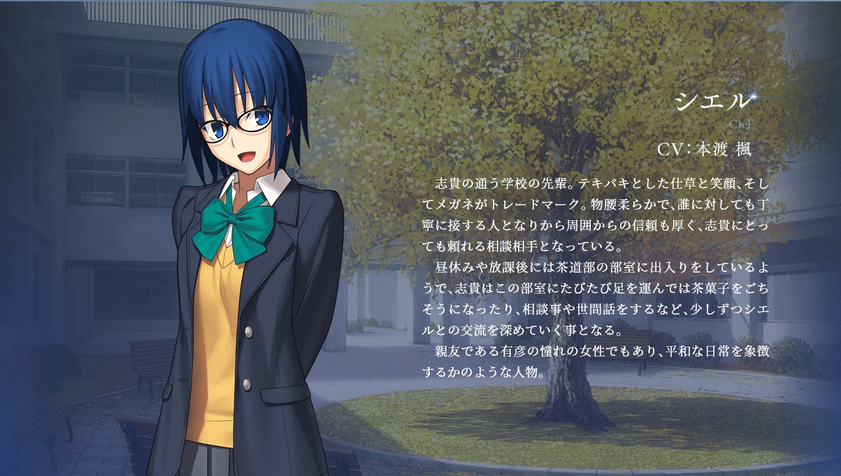 시키가 다니는 학교의 선배. 재치있는 행동과 웃음, 그리고 안경이 트레이드 마크. 부드러운 말투로 누구에게나 정중하게 대하는 사람으로서 주위로부터의 신뢰도 두터워, 시키에게 특히 의지할 수 있는 상담 상대가 되고 있다. 점심이나 방괴후 시간에는 다도부의 방에 출입하여, 시키는 이 방에 자주 찾아가 다과를 대접받거나 상담이나 세상살이 이야기를 하는 등 시엘과의 교류를 쌓아가게 된다. 친구 아리히코가 동경하는 여성이기도 하며, 평화로운 일상을 상징하는 듯한 인물. |