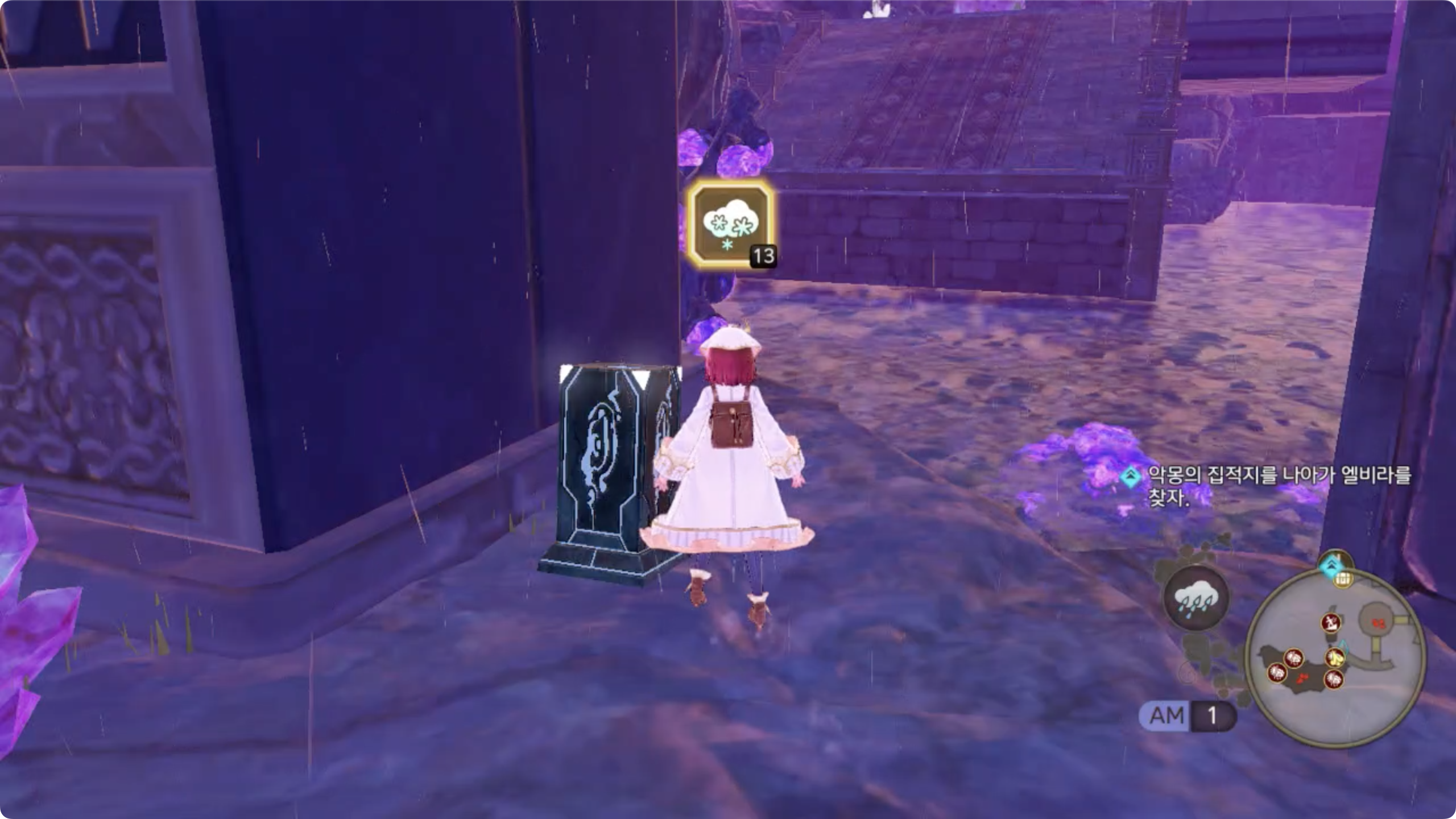 북서쪽 끝의 비석을 이용해 날씨를 눈으로 변경. 물레방아를 지나 북쪽의 비석에서 다시 날씨를 번개로 변경
