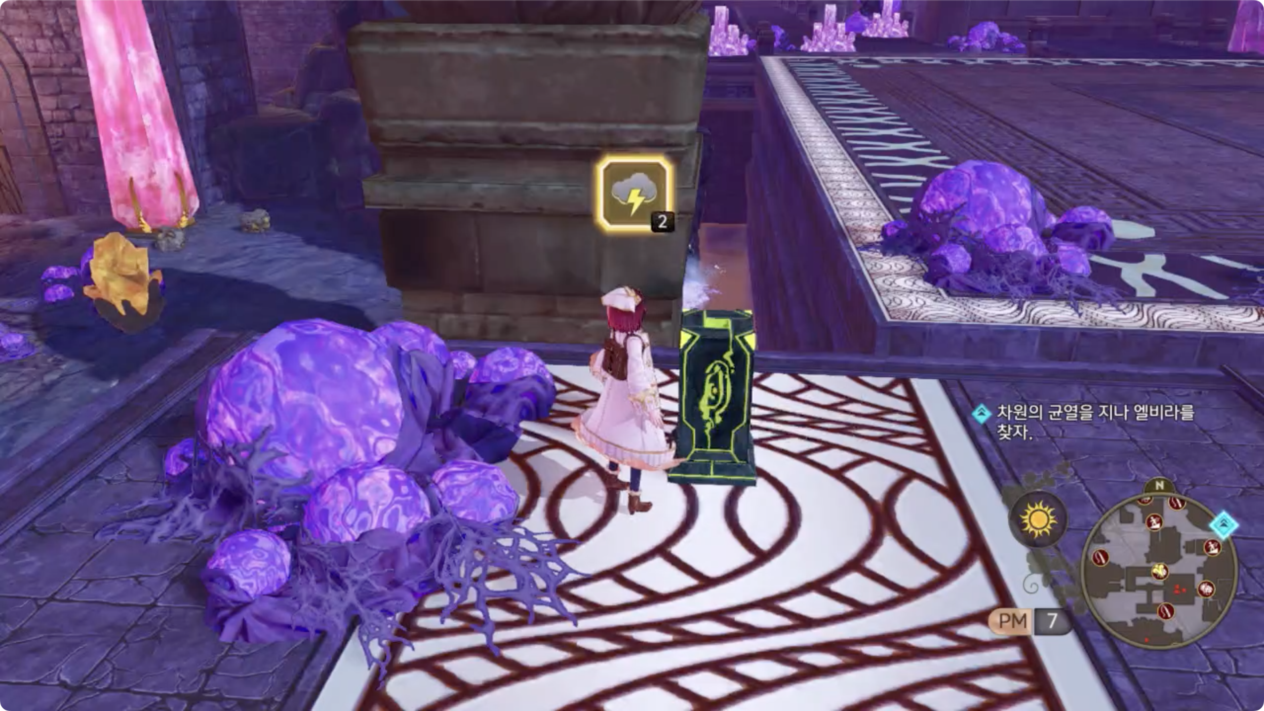 (원형 건물의)북쪽으로 이동한 후 목적지를 향해 계속 이동. 북쪽의 막한 길은 바로 앞에 있는 기둥을 이용해 날씨를 맑음으로 변경하면 된다.