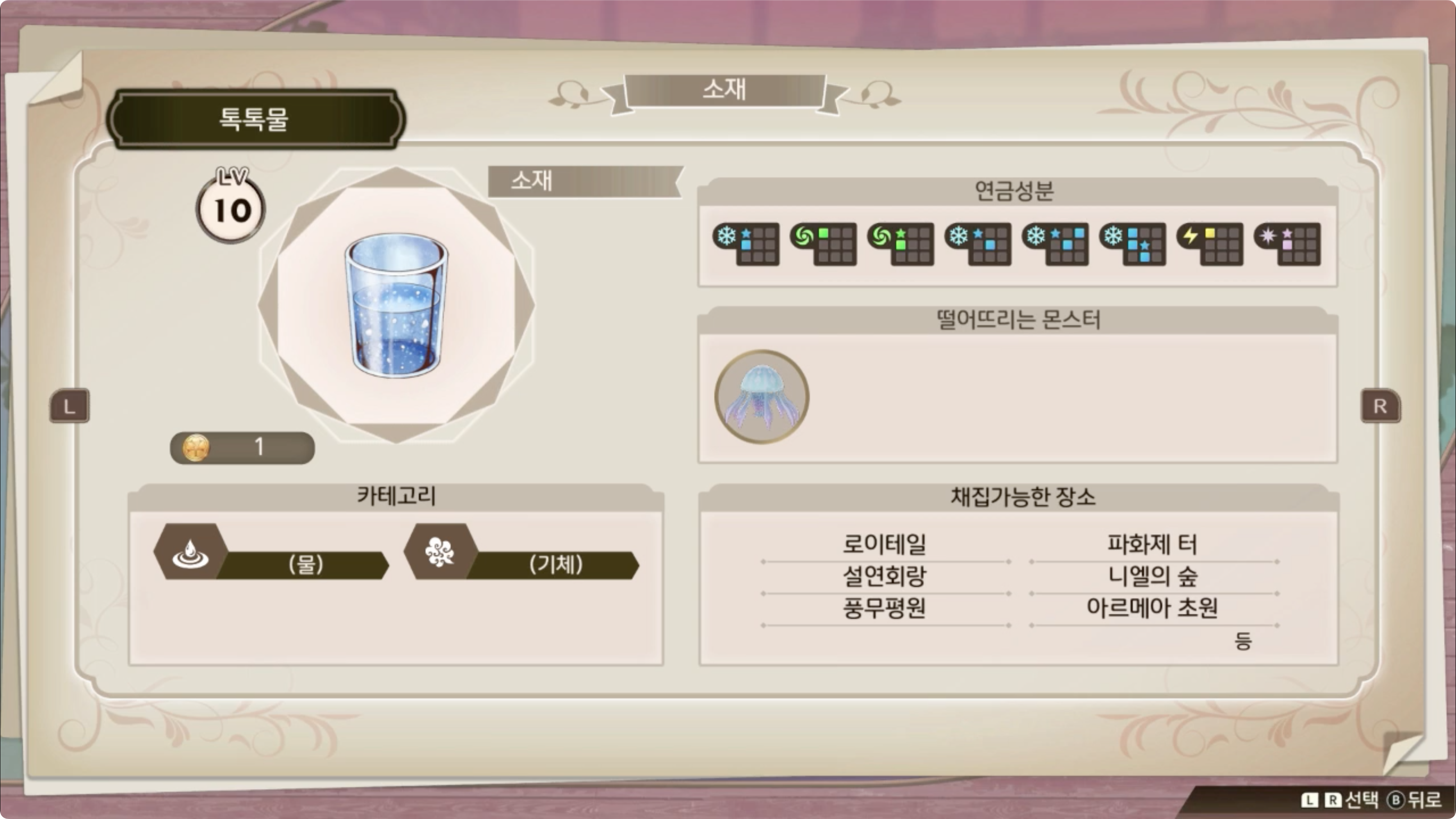 | 소피의 아틀리에2 - 도감(소재) : 01. 식용수(飲める水) (0) | 2022.04.11 |