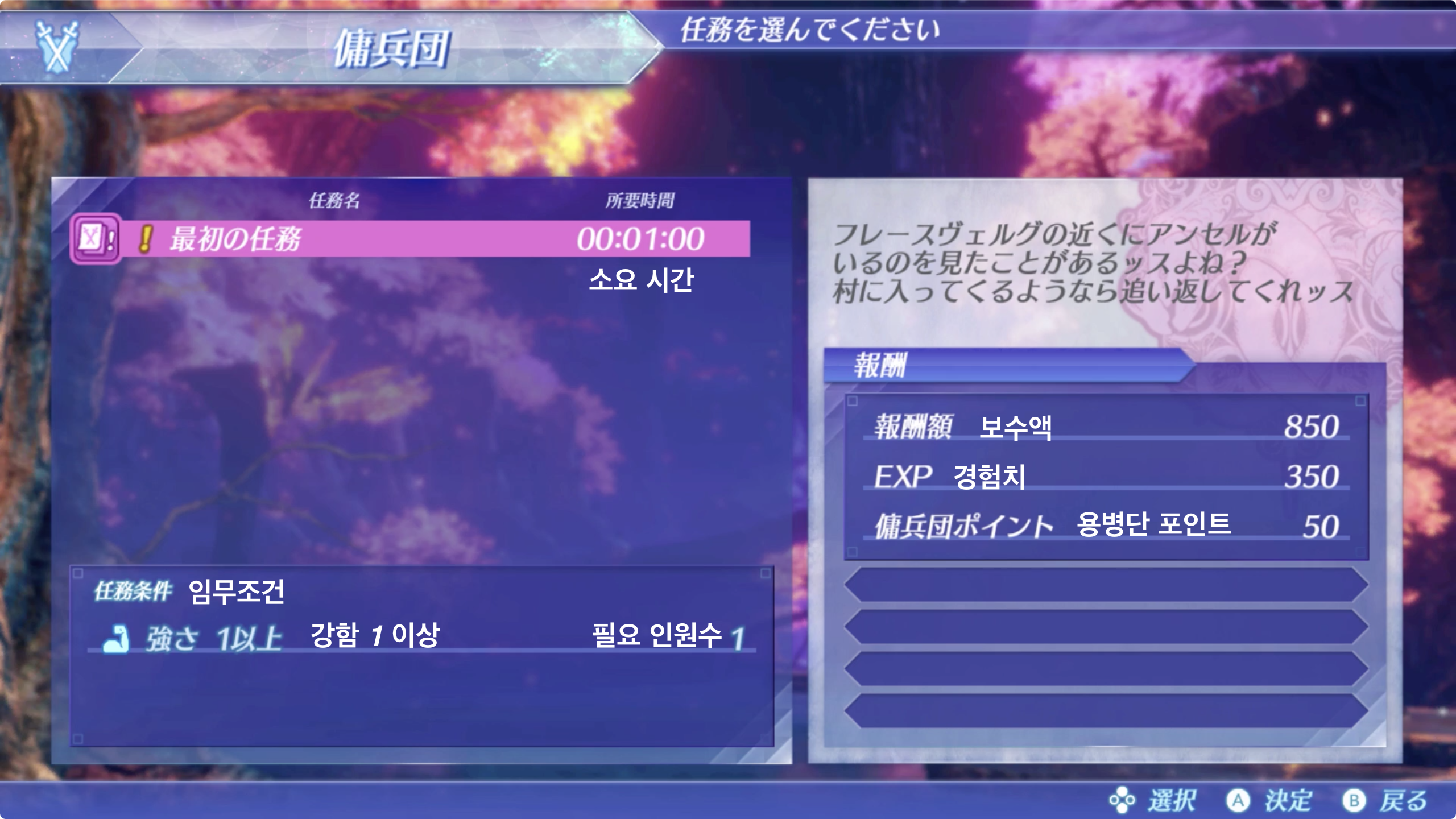 X를 눌러 메인 메뉴를 열어 용병단을 선택한 후 최초의 임무 (最初の任務)를 선택합니다.