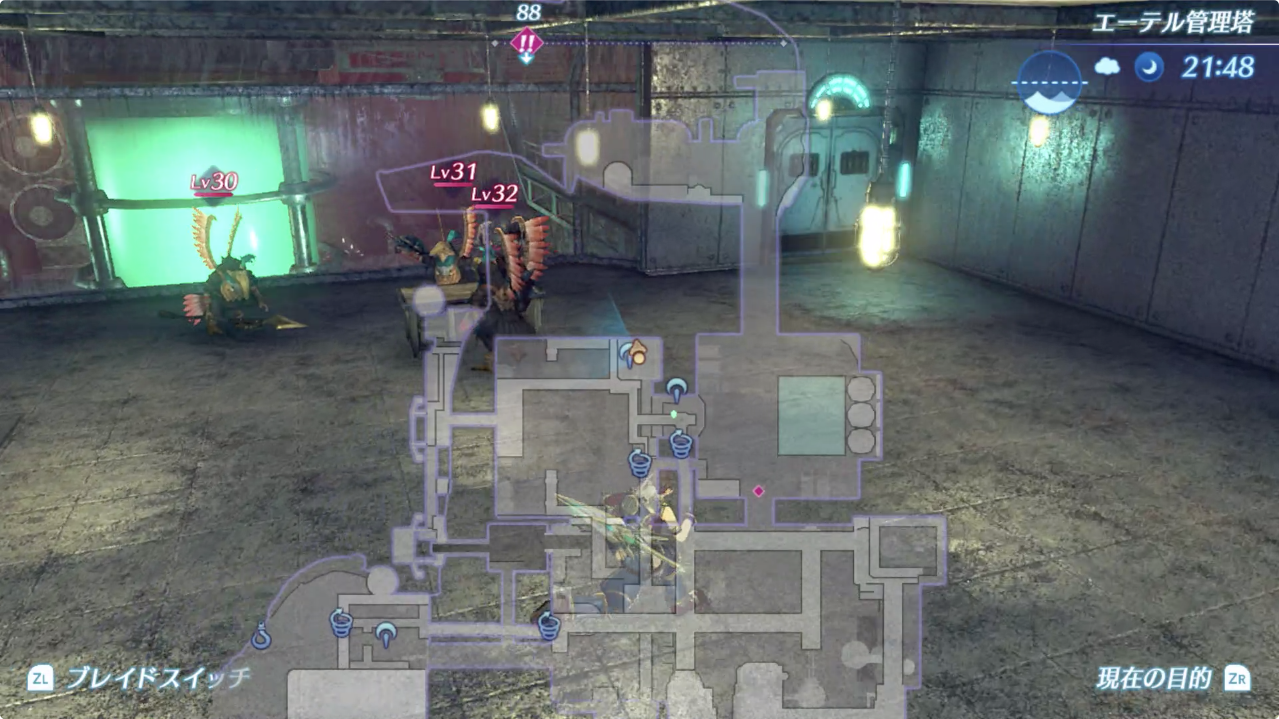 우선 첫번째 목표는 북쪽에 있는 에텔 관리 타워(エ-テル管理塔)로 들어가서 위층에 있는 에텔 탱크 조작반(장소는 아래 스크린샷 참조) 을 가동해야 합니다.