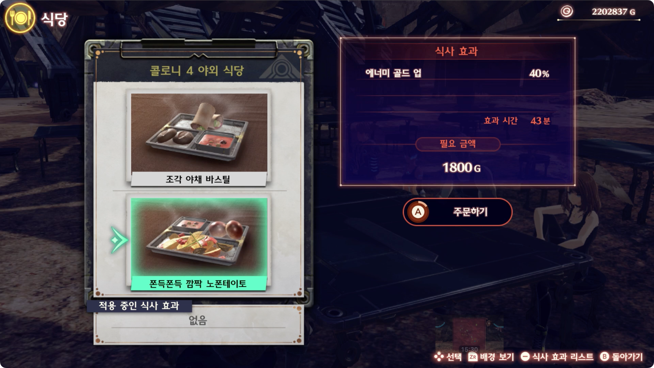 두 요리의 식사 효과는 에너미 골드 업 40%, 효과 시간은 43분, 필요 금액은 1800G로 동일합니다.