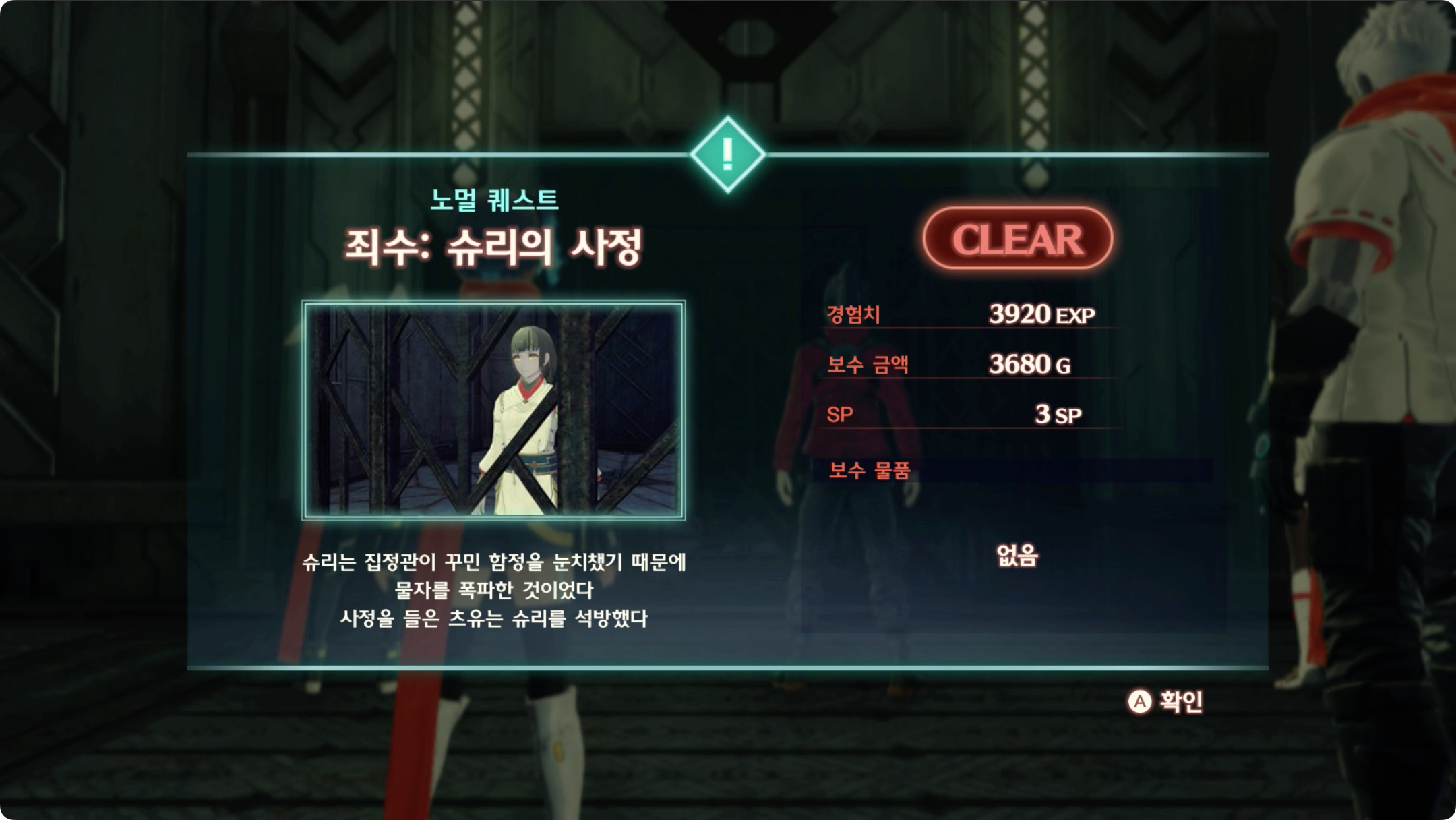 ▷ 노멀 퀘스트 「세 명의 죄수」 진행 중 슈리에게 대화를 건다.