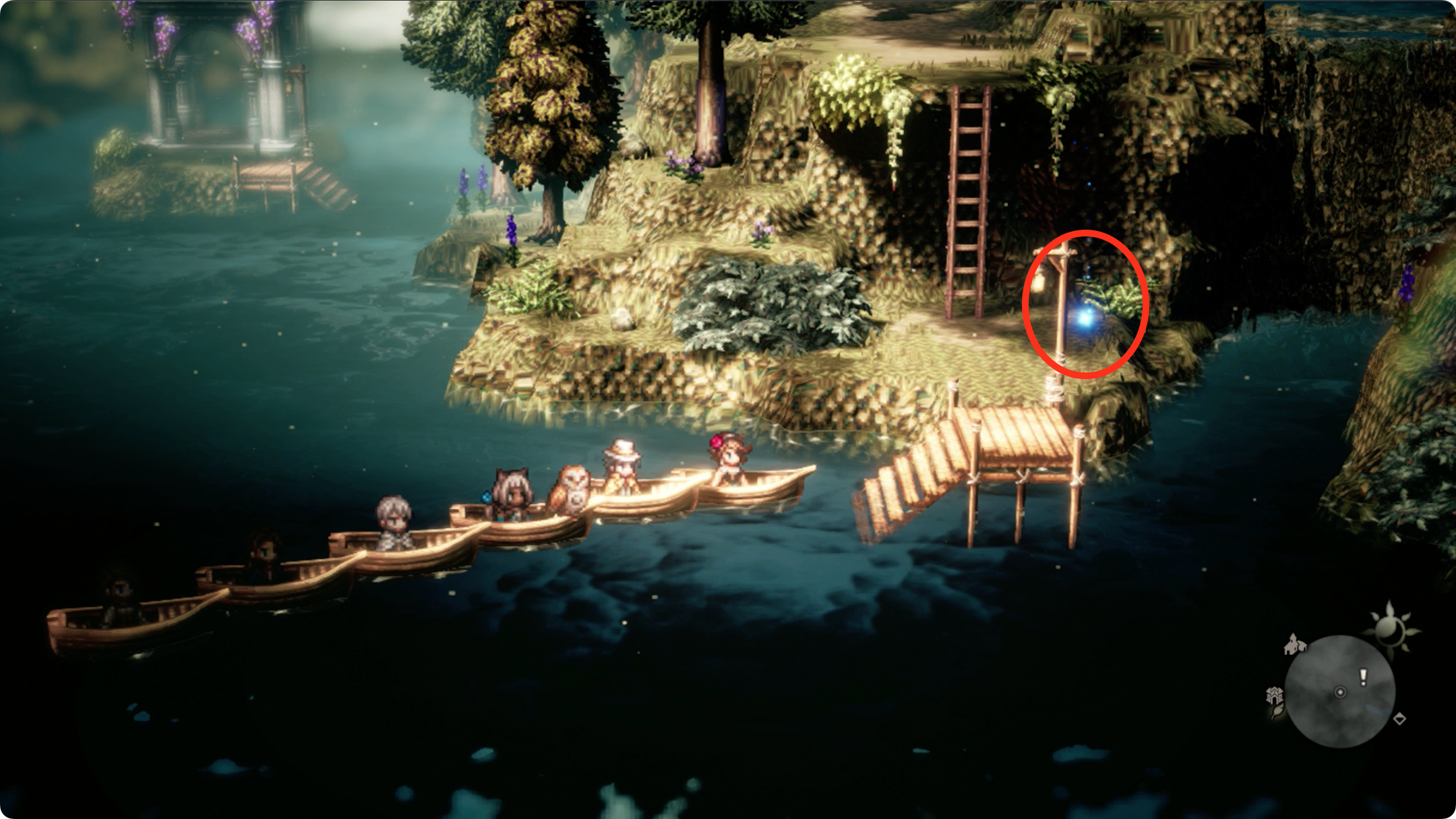 02. '남 팀버레인 숲길'의 중앙 부근에서 땟목을 타고 건너편에서 '무기점에서 도둑맞은 도검'을 입수한다