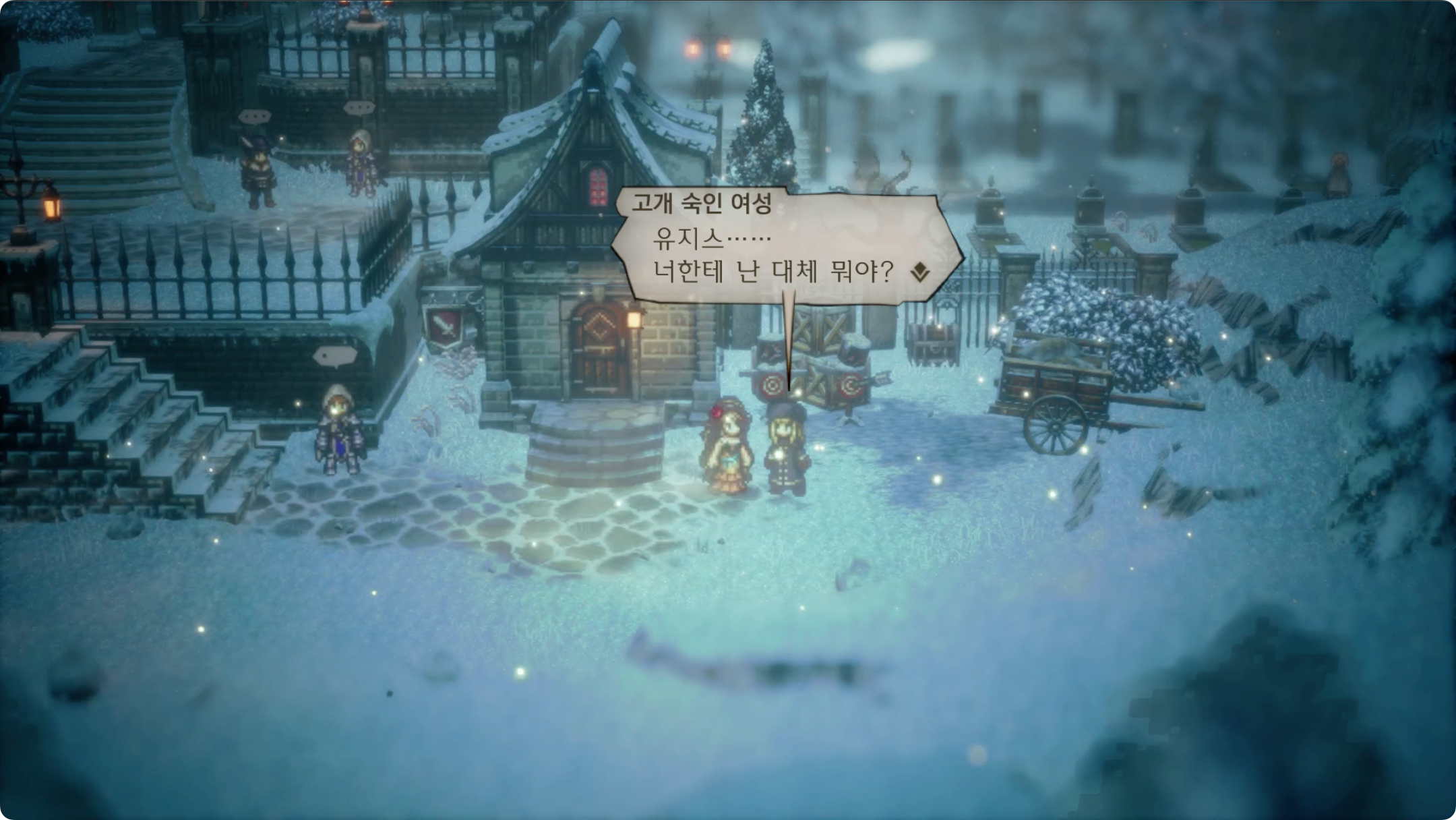 B-03. 유지스를 데리고 있는 상태로 [윈터랜드 지방] 스톰헤일의 '고개 숙인 여성'과 대화한다