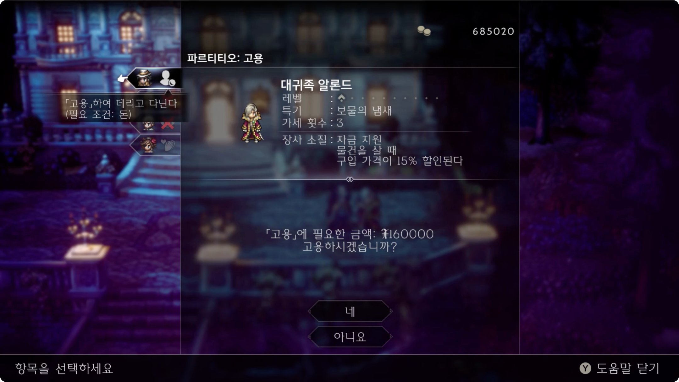 03. 파르티티오의 '고용'을 이용하여 알론드를 16만 리프로 고용합니다.