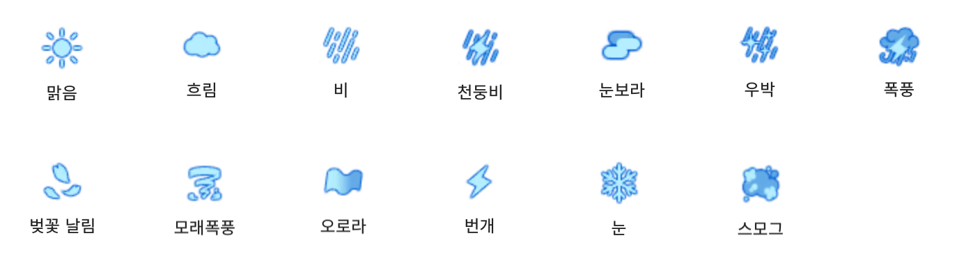 | 지역명 | 날씨 종류 | 지역명 | 날씨 종류 |