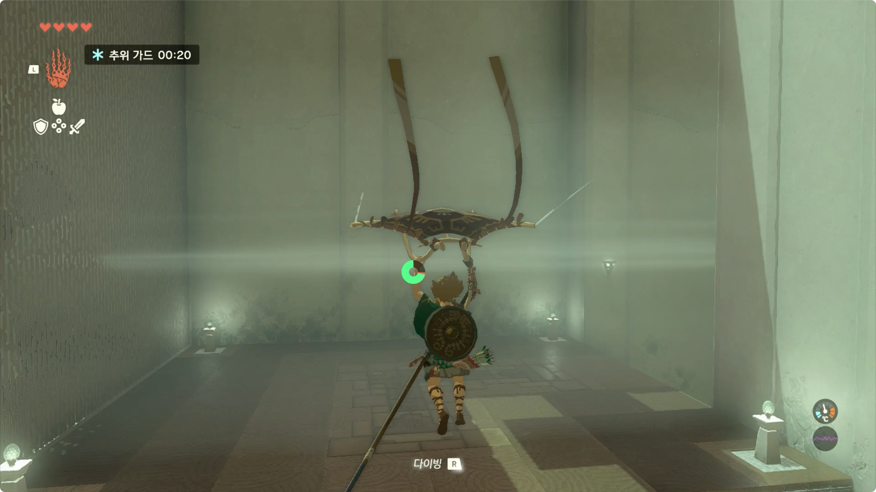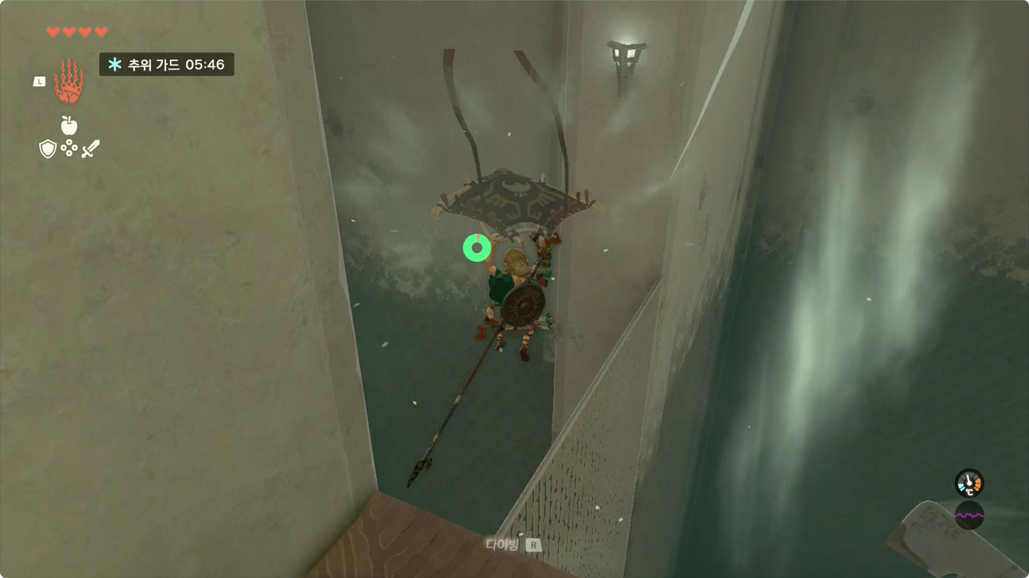 (2) 아래쪽으로 내려가야하는데 그냥 떨어지면 대미지를 입으니 페러세일을 짧게 폈다가 바로 접는것을 반복하며, 천천히 내려간다.