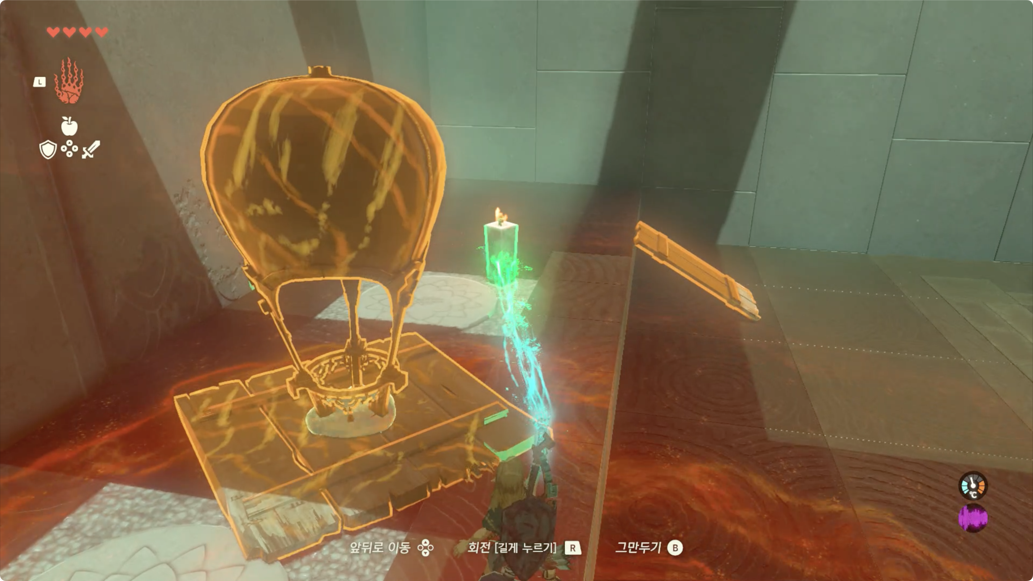 (4) 이전과 동일하게 기구에 발판을 붙이고 중앙에 구슬을 올려놓은 후, 촛대를 가져와 하늘 위로 올릴 수 있습니다.