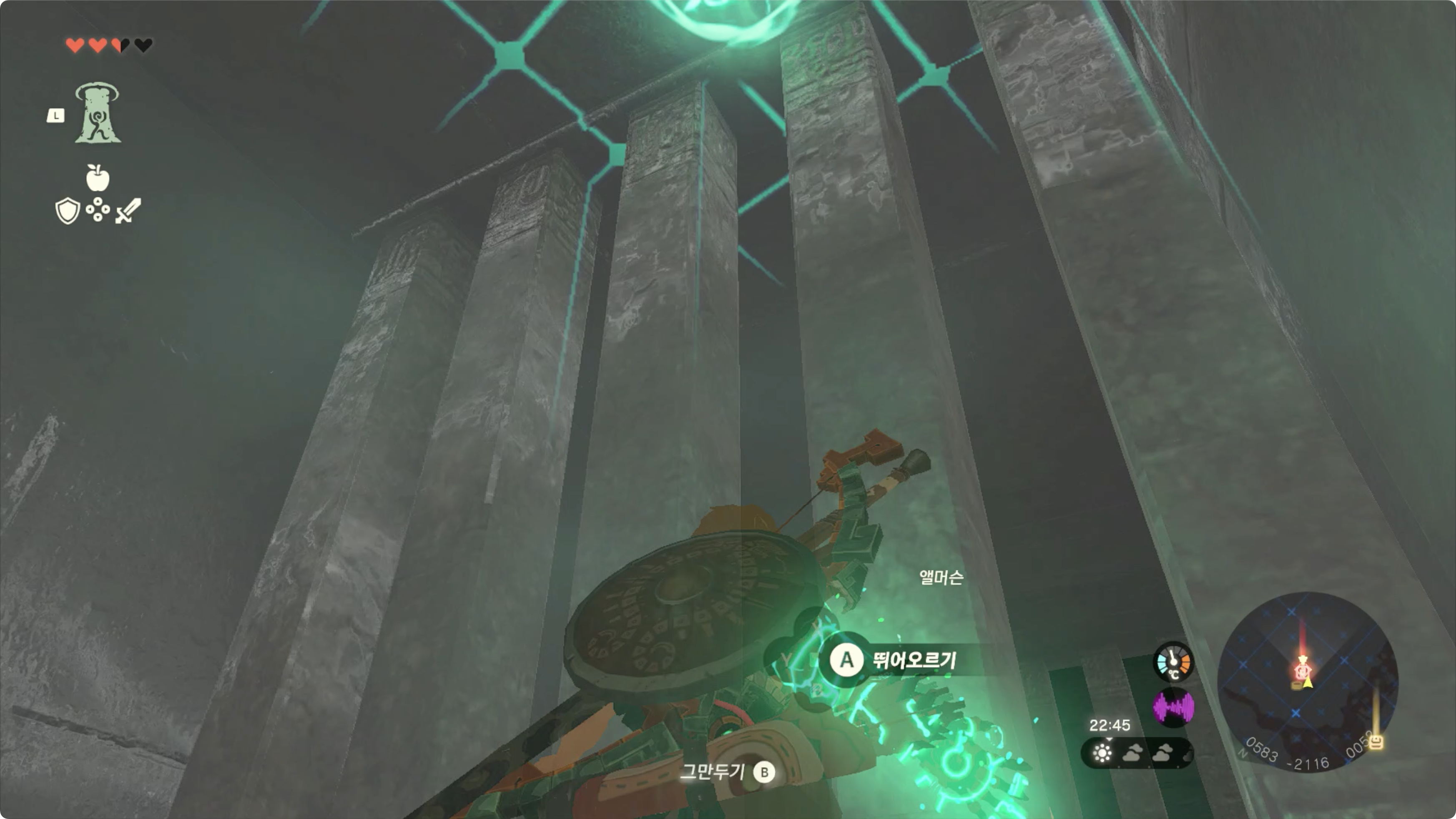 앨머슨을 꺼내준 후, 다시 길을 돌아가기 귀찮으니 보물상자를 스위치 위에 올려놓고, 안쪽으로 이동하여 트레루프로 위로 올라갑시다.