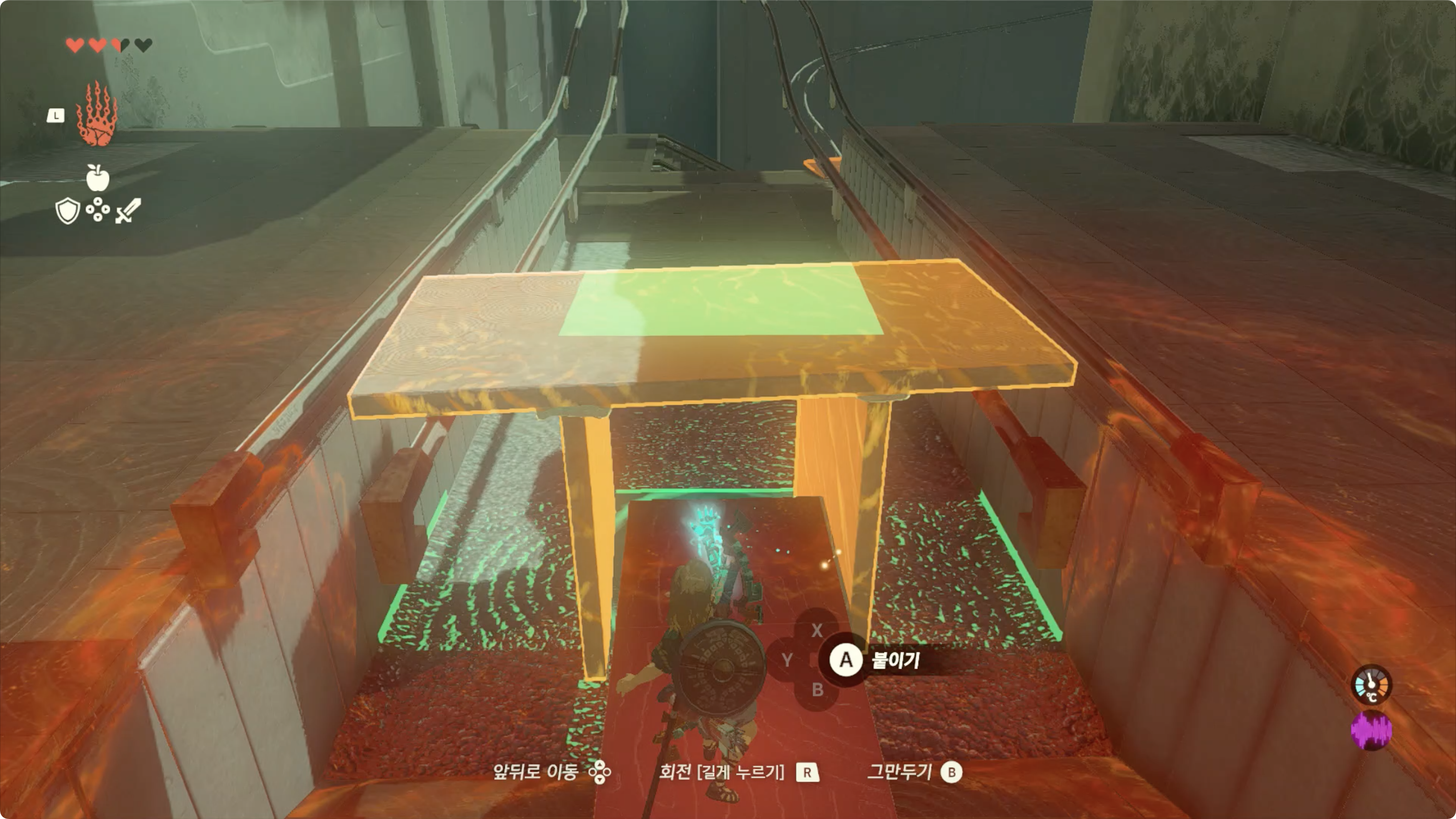 (1) '울트라 핸드'를 이용하여 바닥에 있는 석판을 붙인 후, 레일에 가로로 올린후 올라탄다.