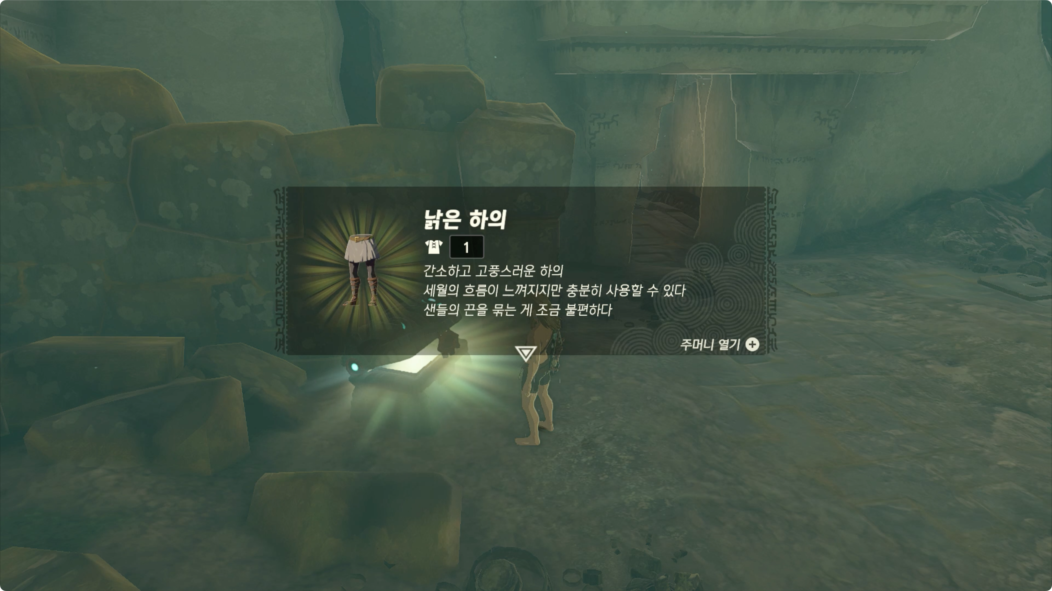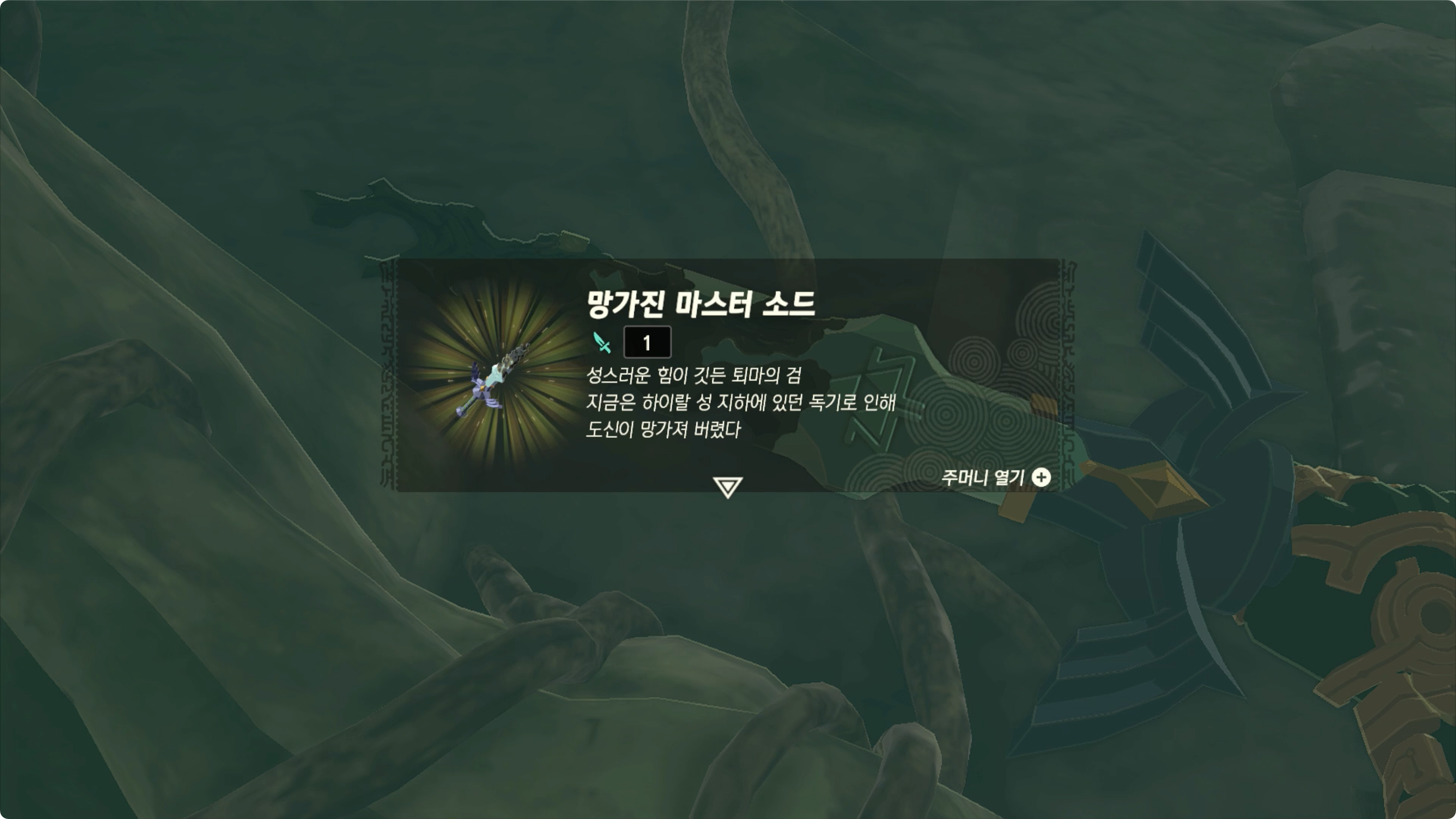 앞에 보이는 검자루를 조사하여 '망가진 마스터 소드'를 입수합니다.