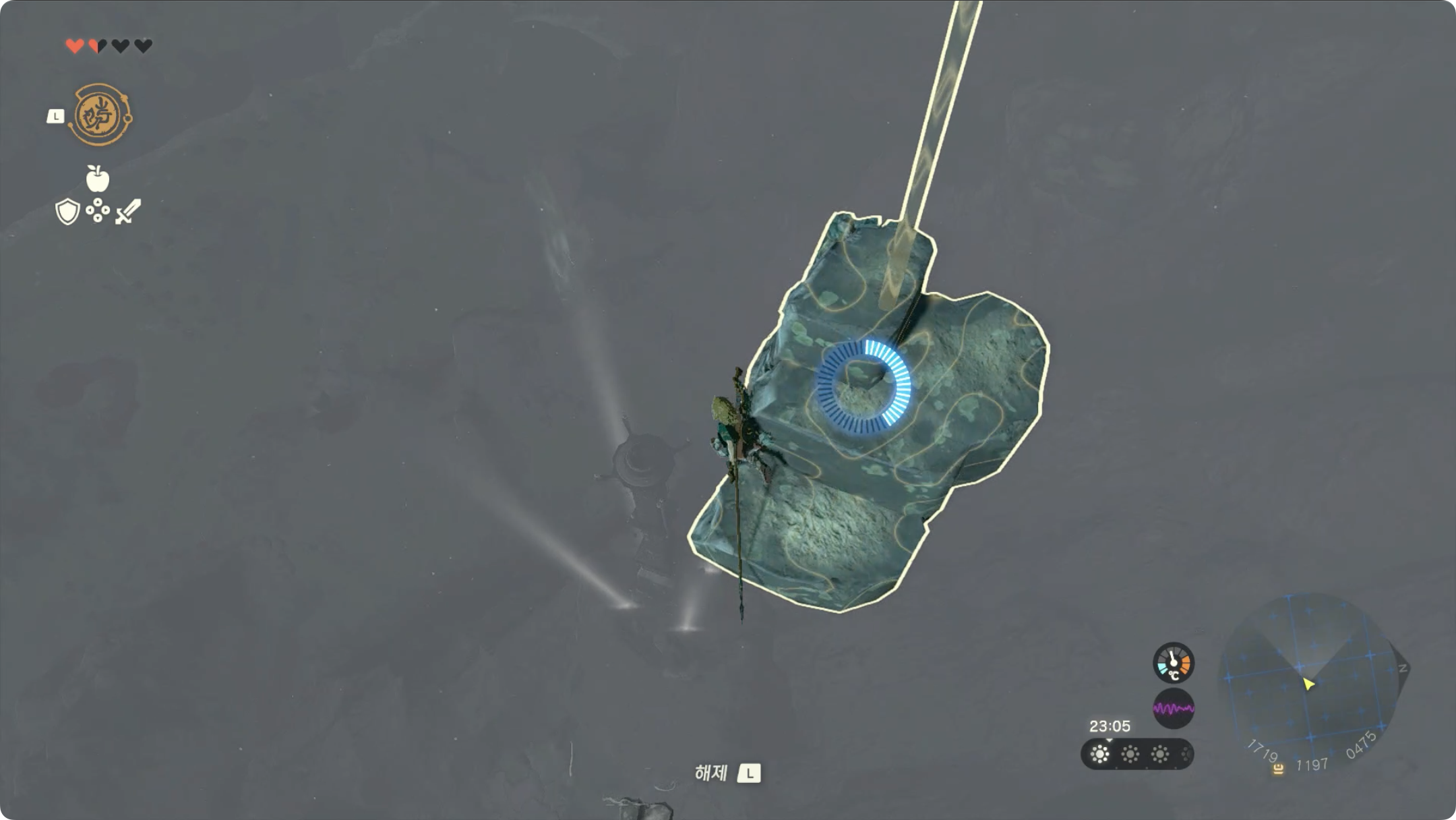 주변을 둘러보면 하늘에서 바위가 계속 떨어지고 있는데, 그 바위를 타고 리버레코를 사용해서 상공으로 올라갑니다.