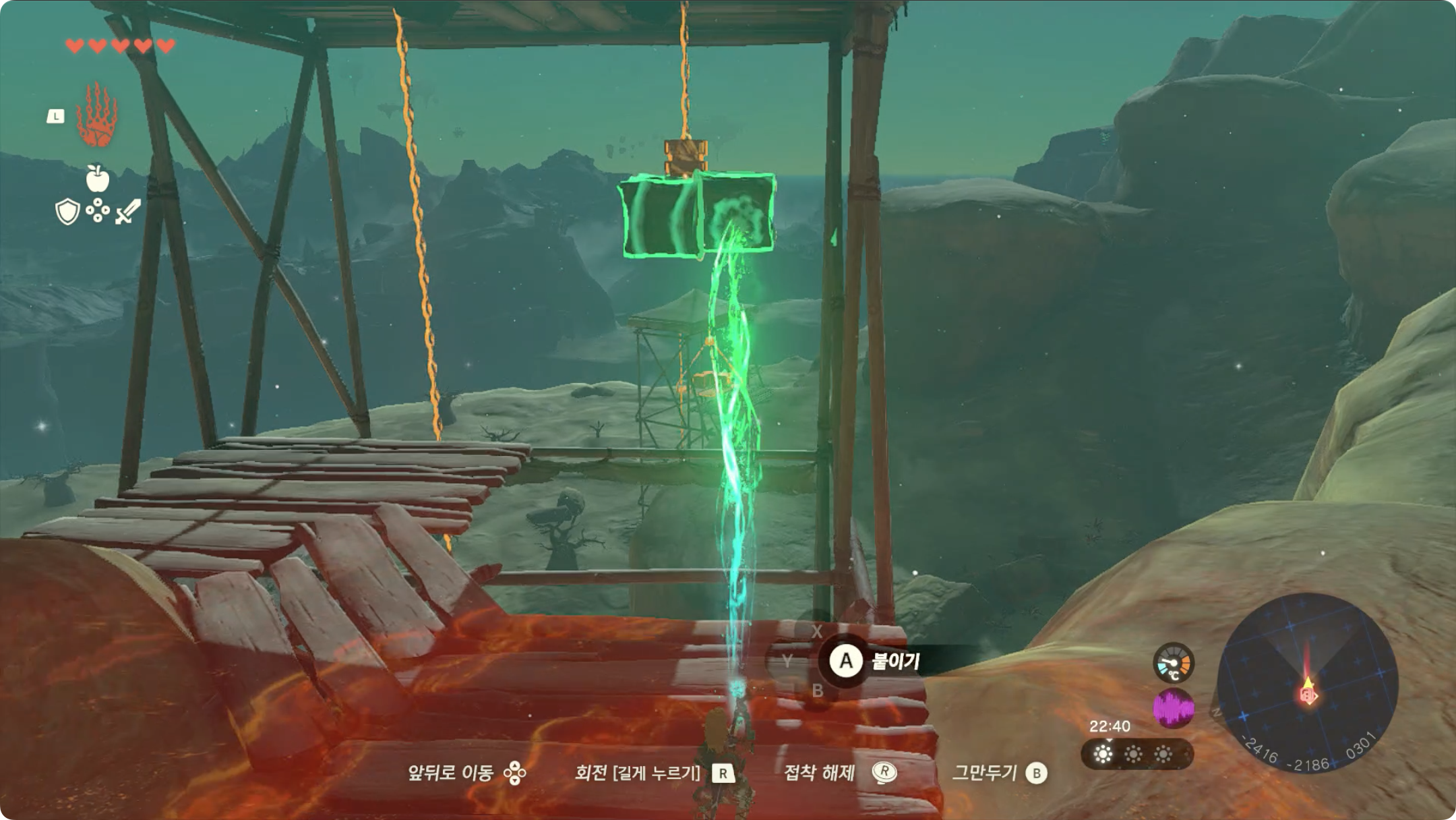 (2) 위로 올라와 조망대 옆의 철 상자를 4개정도 붙인 후, 도르레에 붙여 사우슨을 위로 올린다