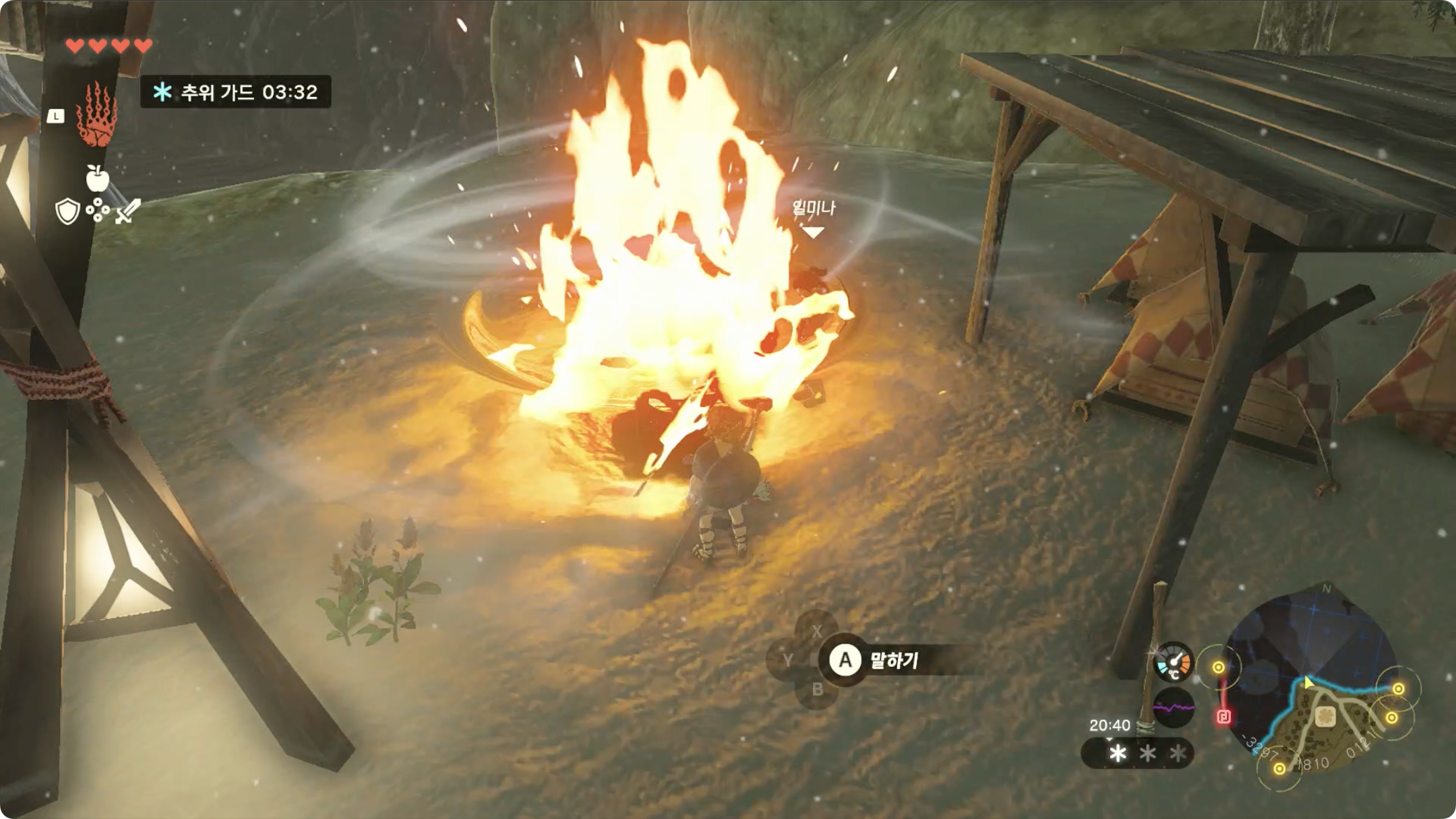 토끼풀 신문사 주변에 떨어져있는 하이랄솔방울을 획득한 후, 화톳불에 하이랄솔방울을 넣으면 상승 기류가 발생합니다.