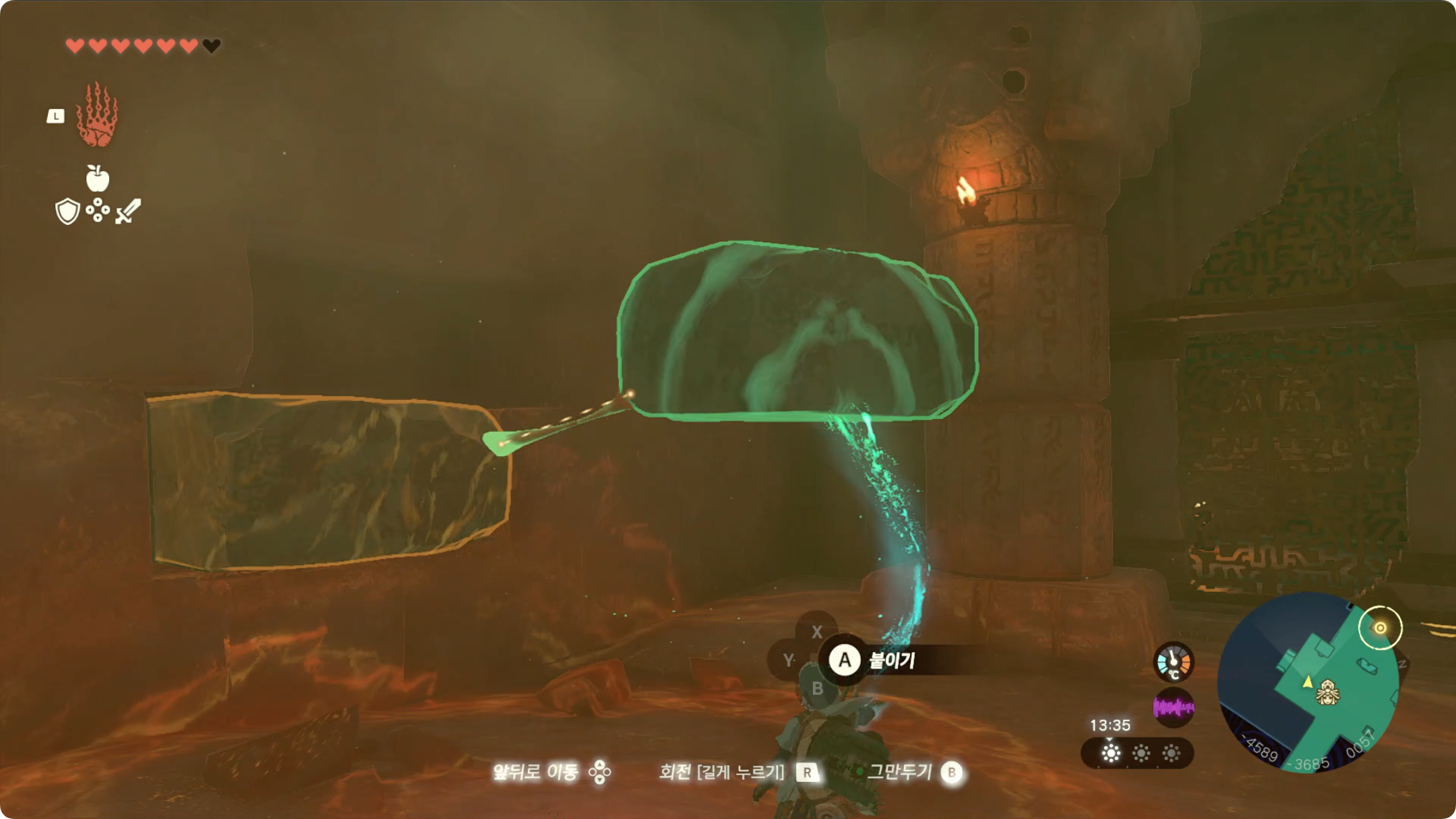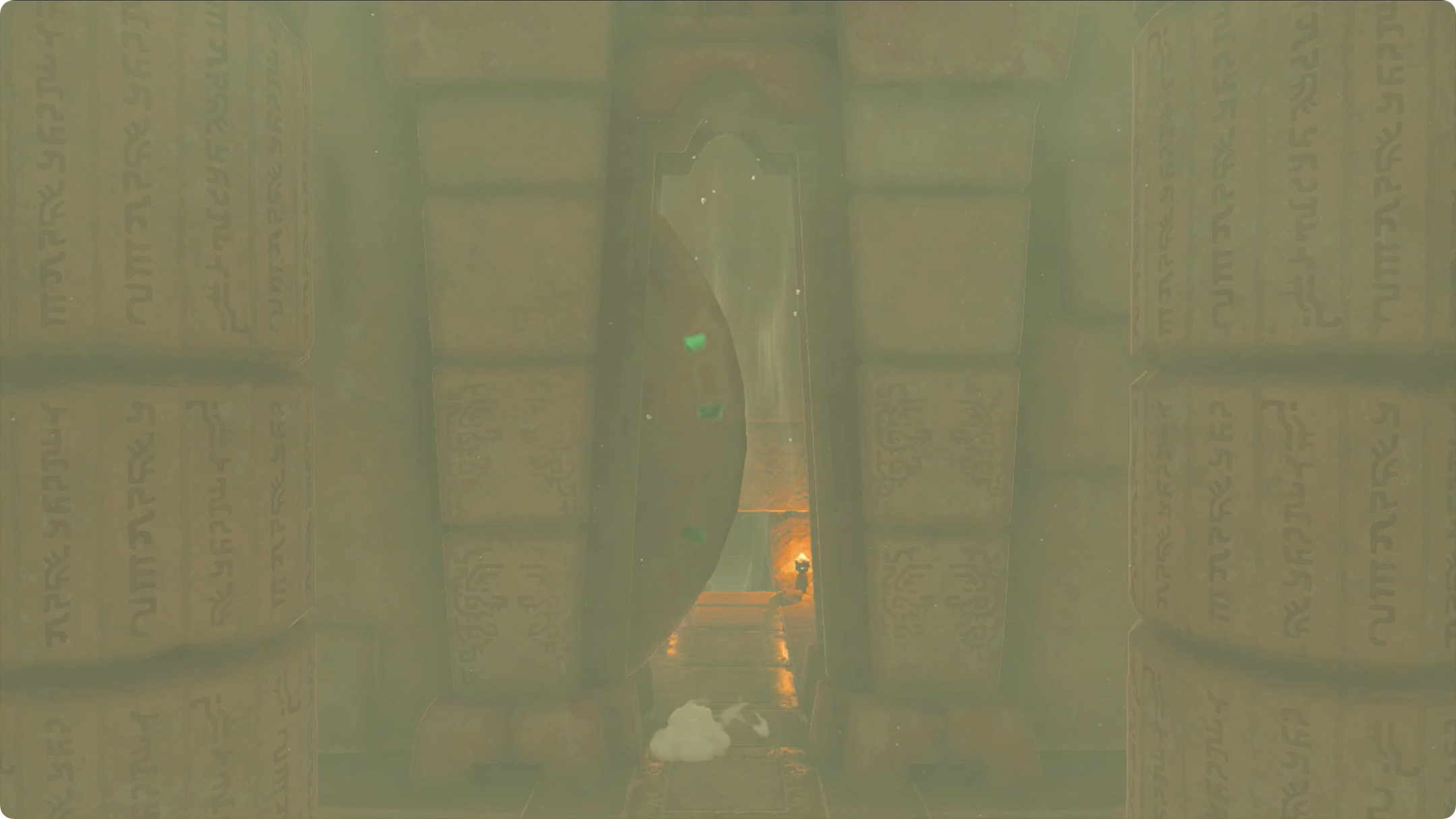 (1) 벽에 있는 '코로그 잎새 부채'를 이용해 모래를 걷어낸 후, 스위치를 밟으면 신전 내부로 이동할 수 있게 됩니다.