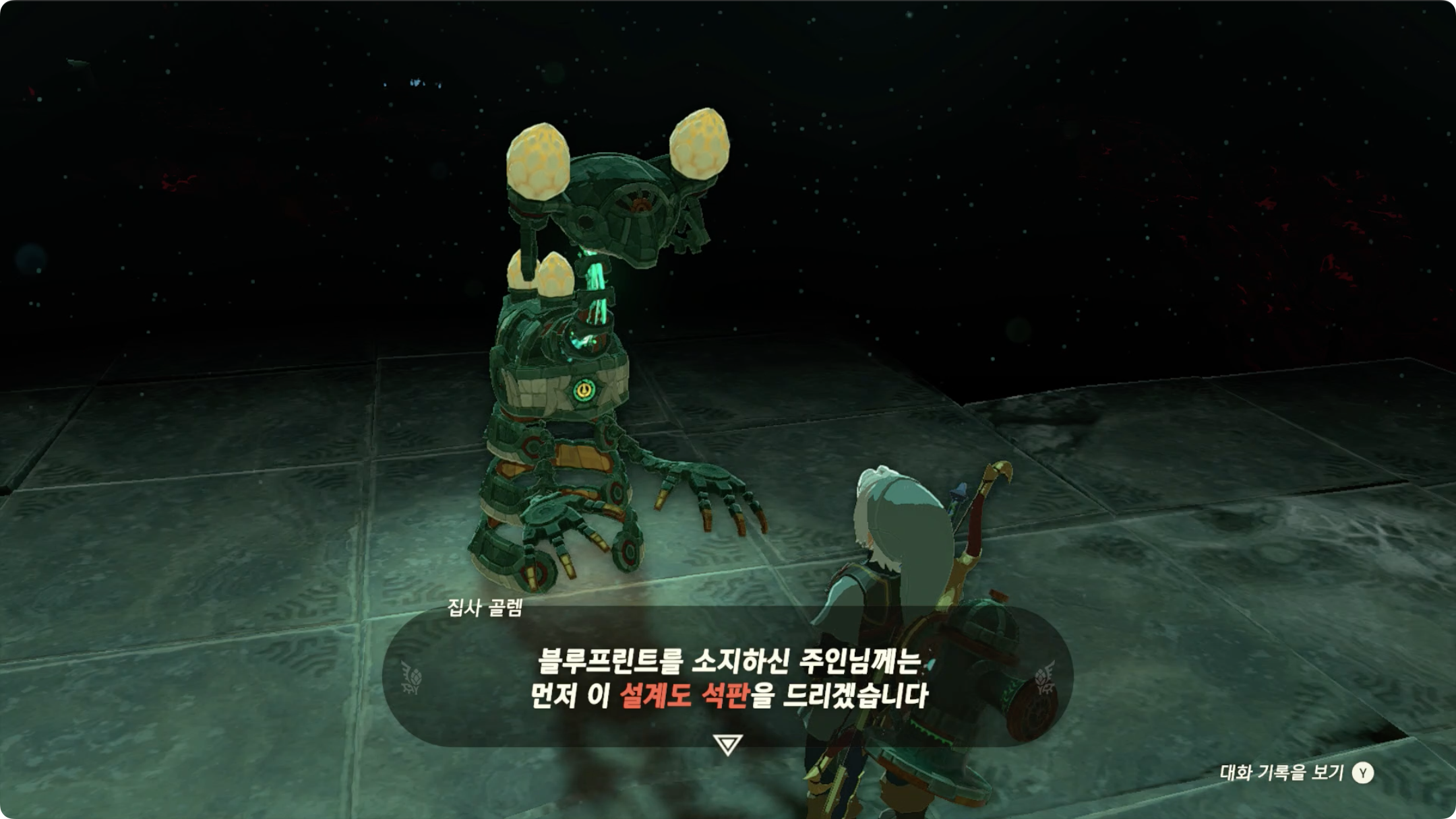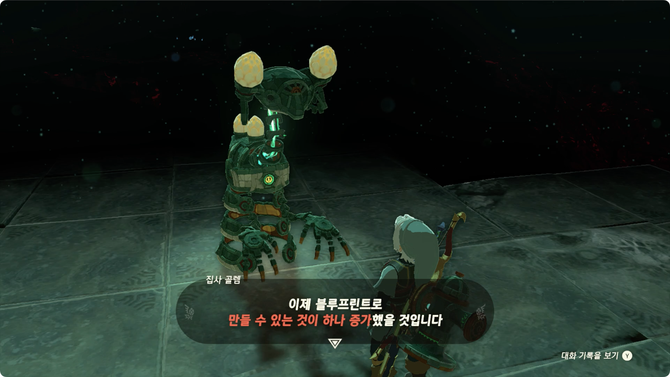 코가님이 도망친 후 보물상자를 입수하면 골렘이 말을 걸어오며 설계도 석판을 하나 받습니다 (자동 완성 레시피)