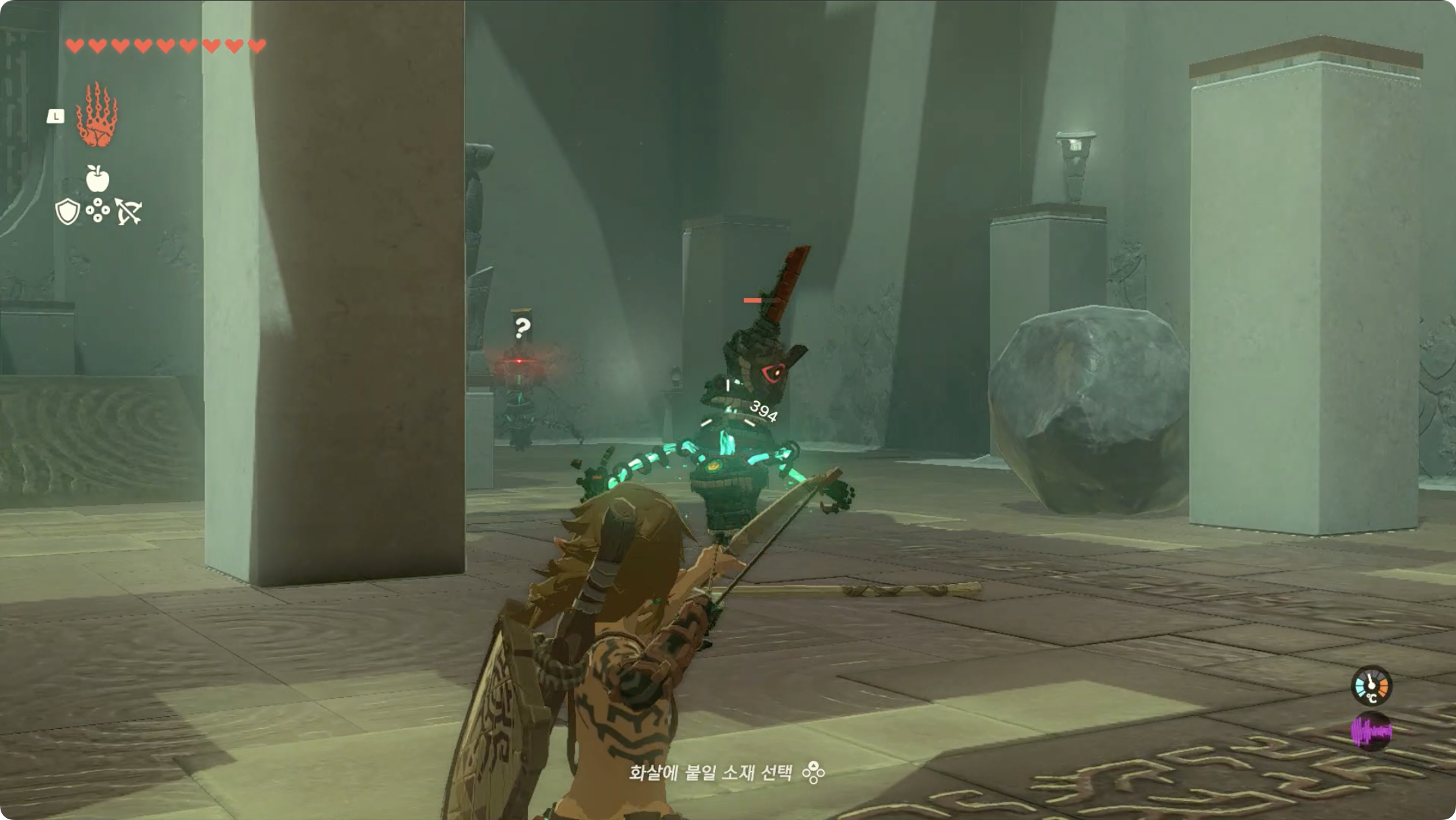 화살을 쏠때 왼쪽에 있는 열매를 붙여 쏘면 조금 더 대미지를 줄 수 있고, 골렘들의 무기를 뺏어 정면에서 싸워도 좋습니다.