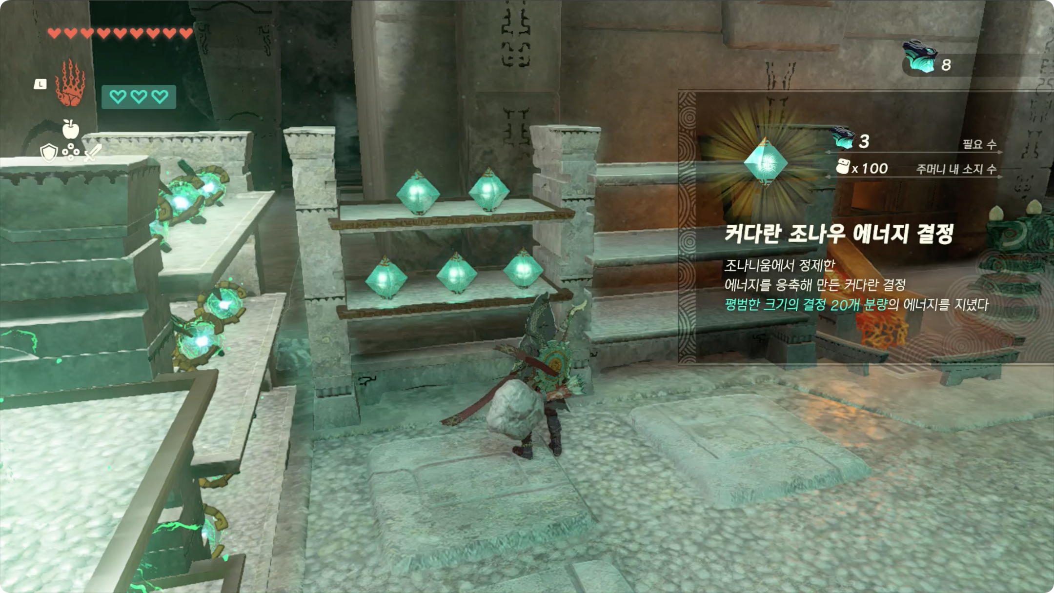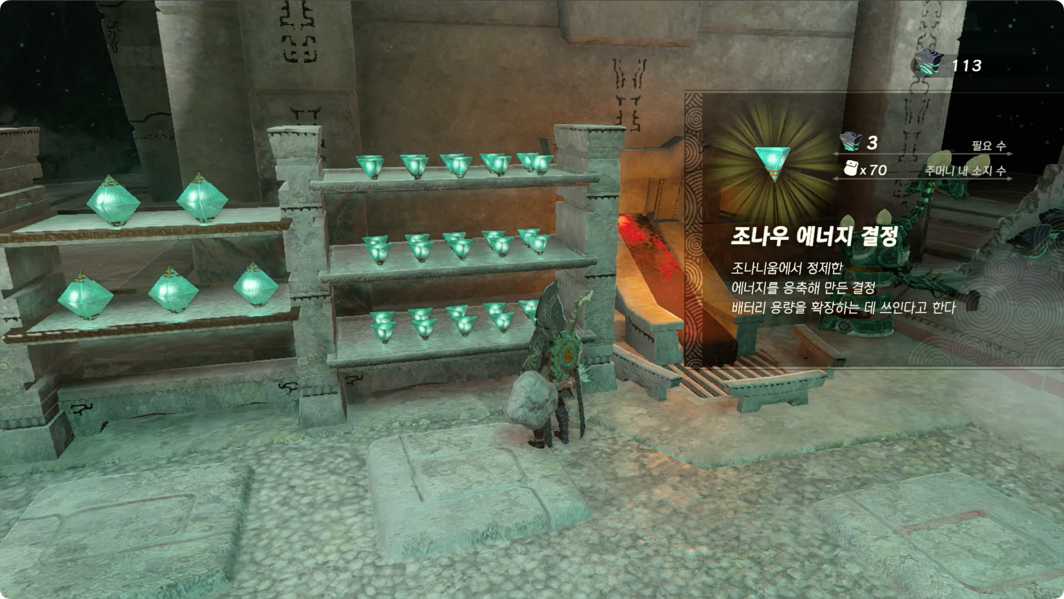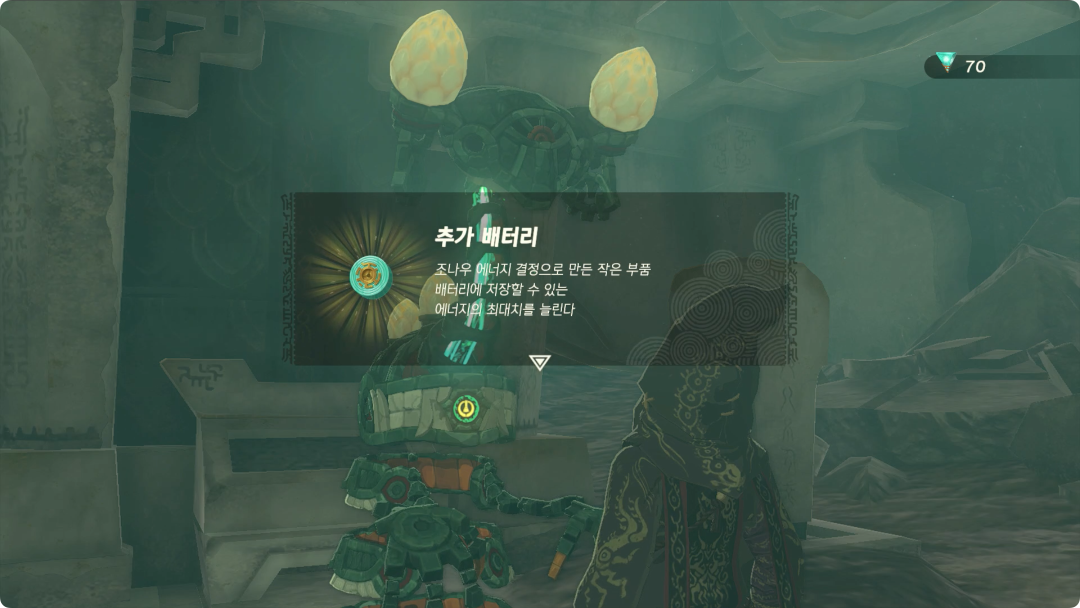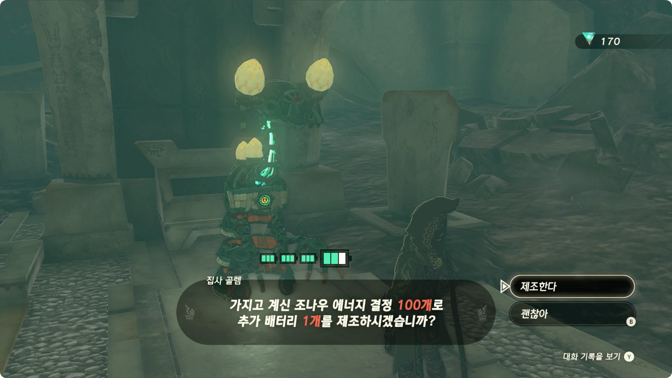 바로 앞에 보이는 골렘에게 대화를 걸면 조나우 에너지 결정 100개를 추가 배터리 1개로 제조해 줍니다.