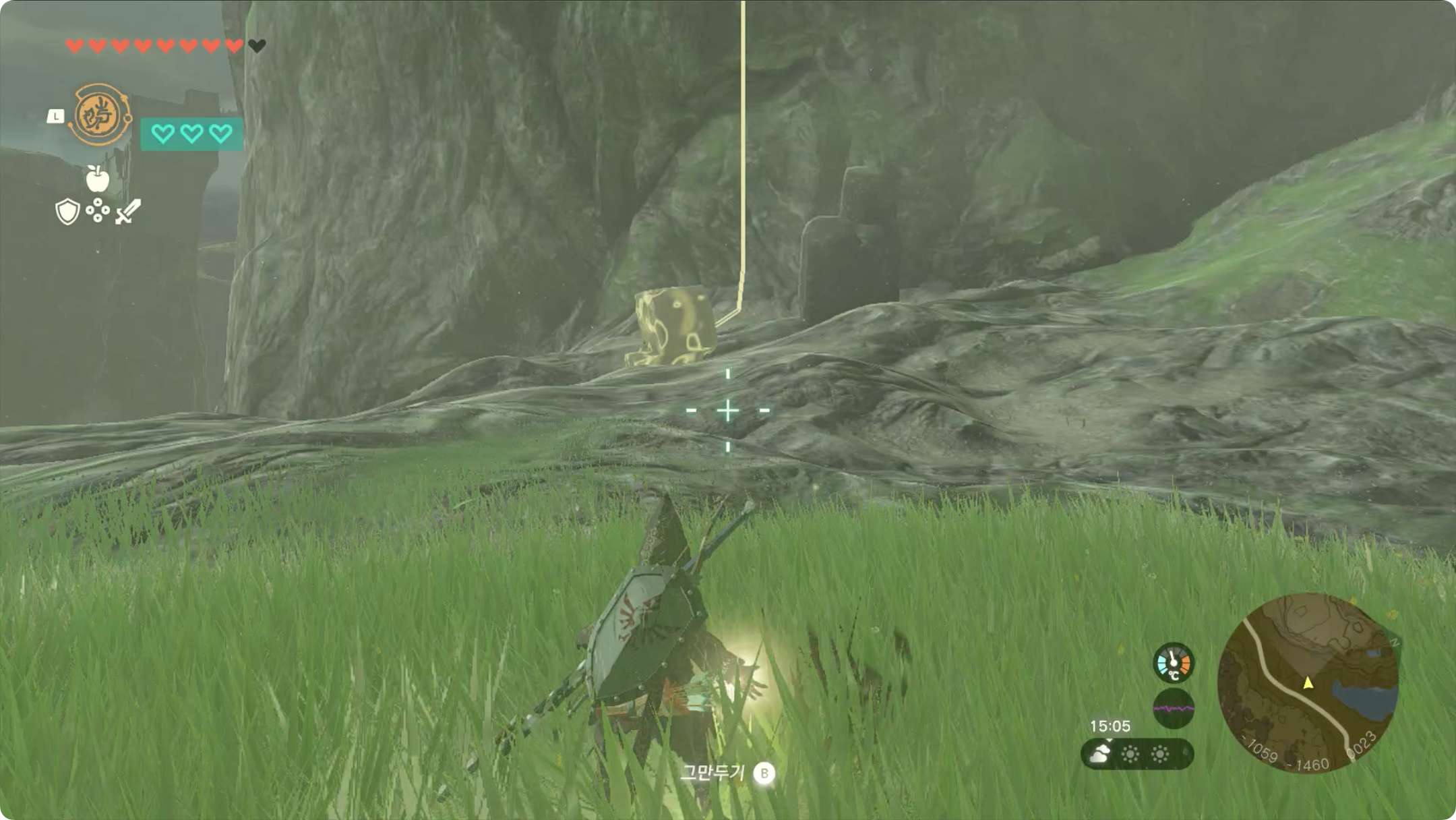 (4) 절벽 위로 올라가야하는데 이 부근은 하늘에서 바위들이 잘 떨어지는 부분이기에 '리버레코'로 바위를 찾아 쉽게 올라갈 수 있습니다.