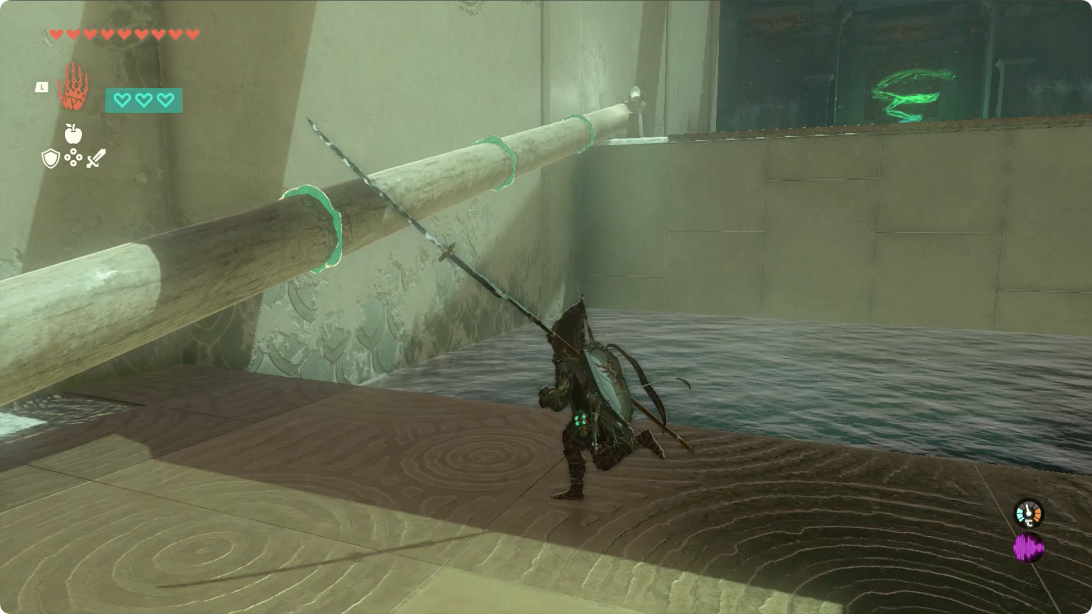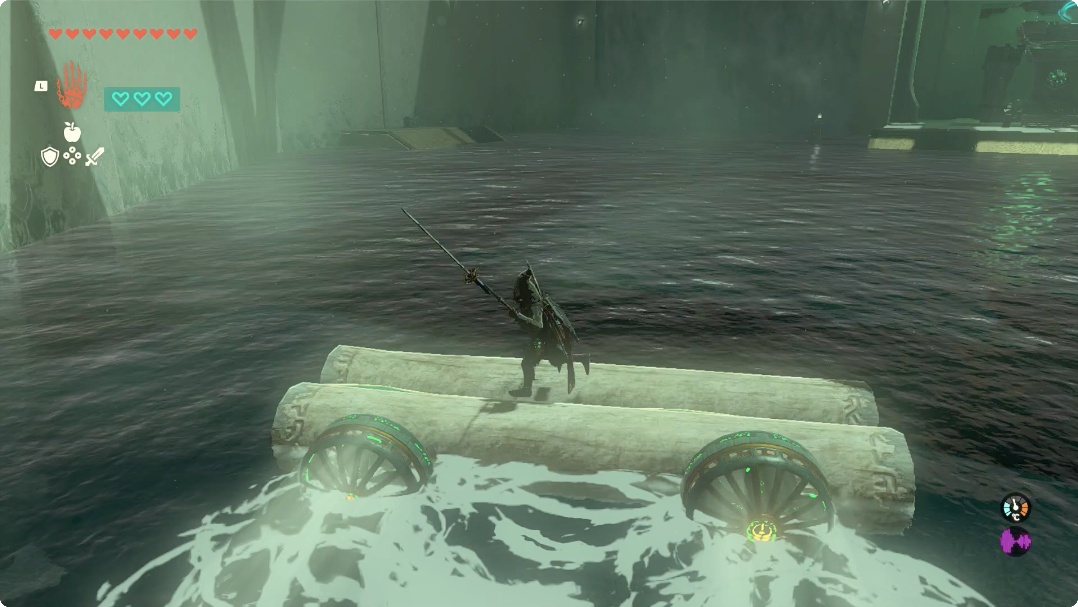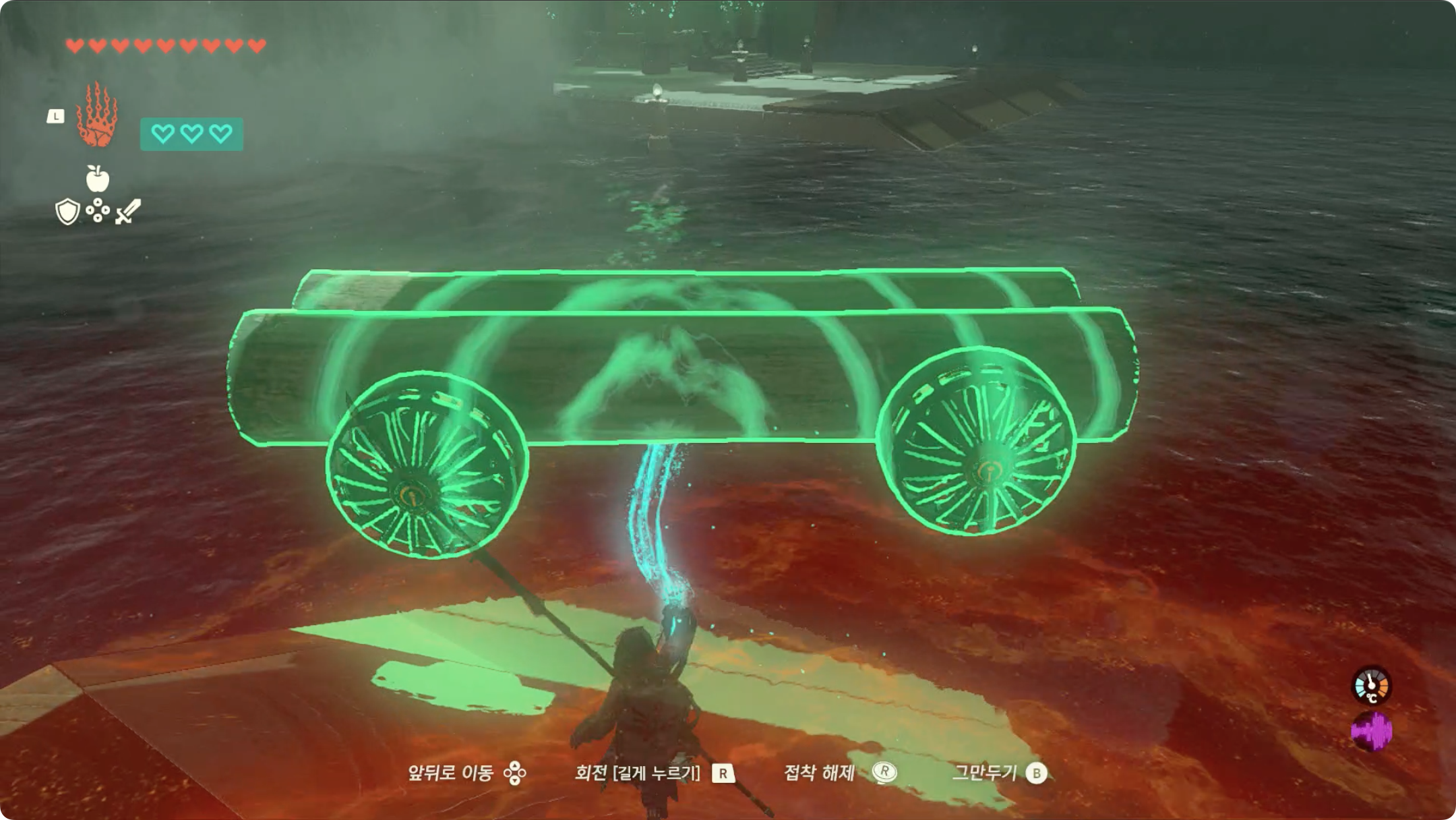 (6) 통나무와 선풍기를 이어붙여 배를 만들고, 사당 출구 왼쪽에 보물상자가 있으니 우선 왼쪽 방향으로 배를 이동시킵니다.