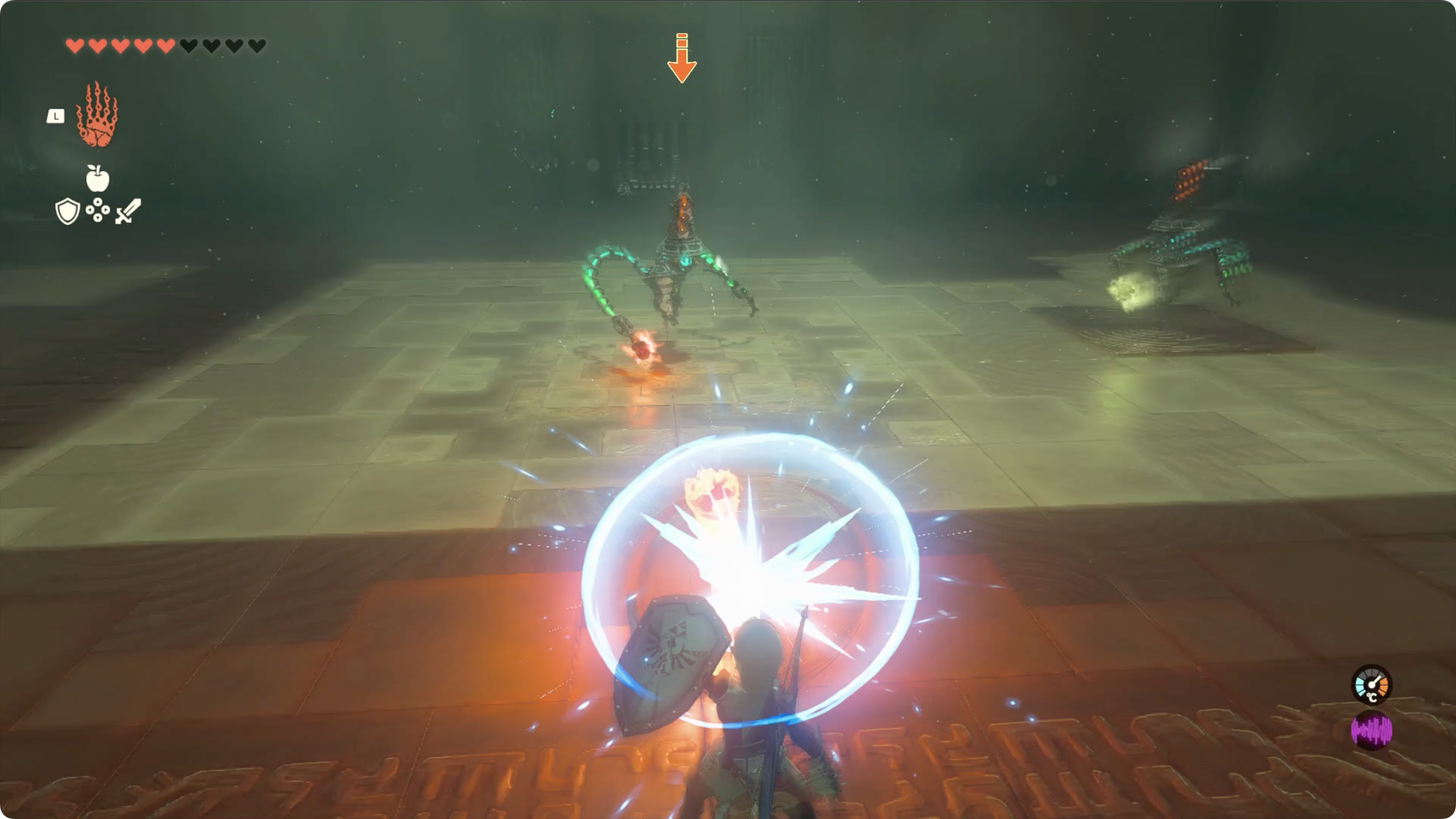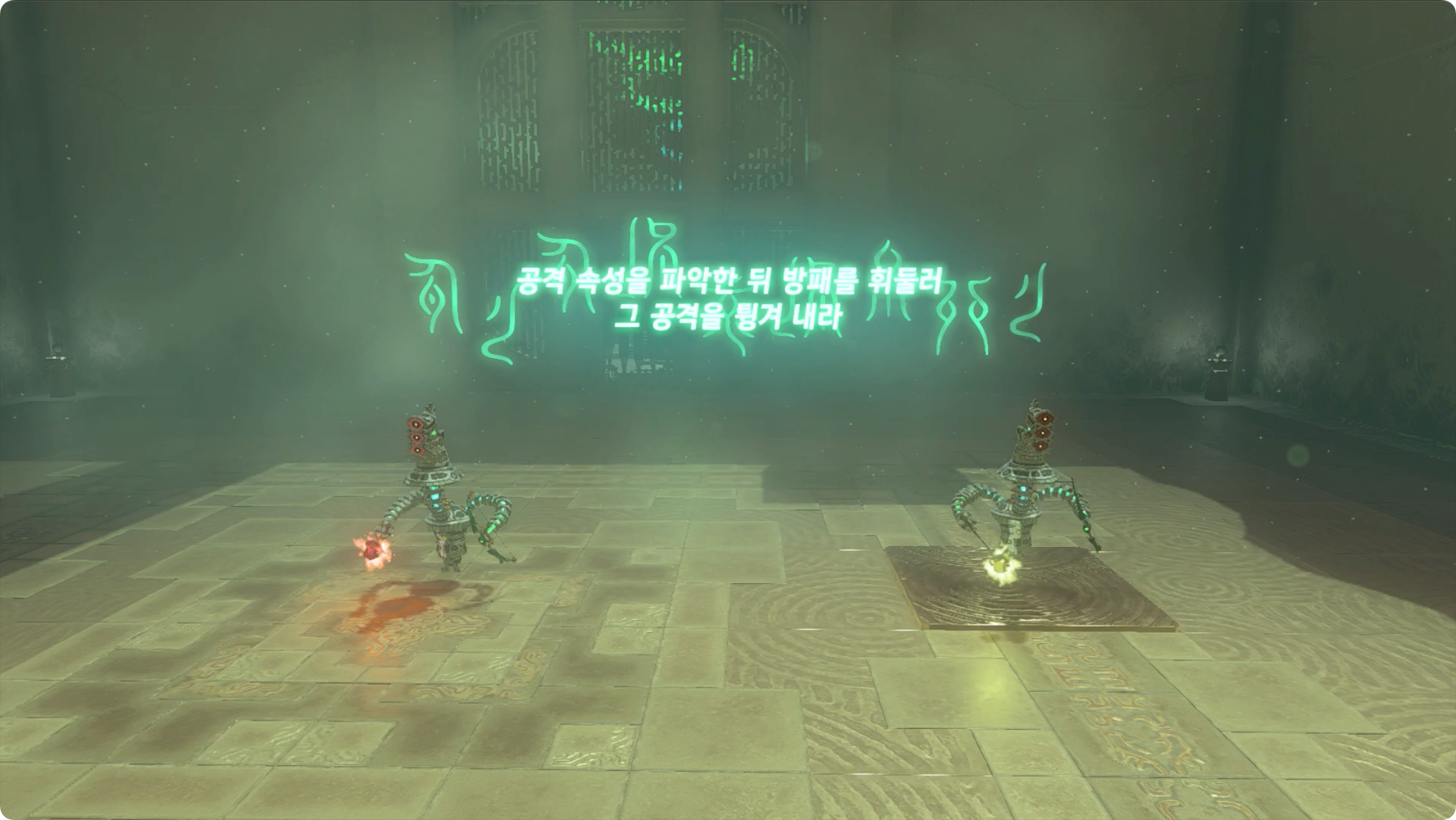 (2) 적이 발사한 것에 맞춰 방패를 휘둘러 공격을 튕궈 냅니다.