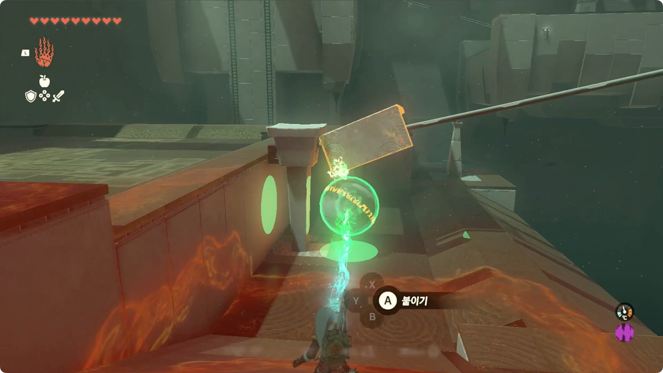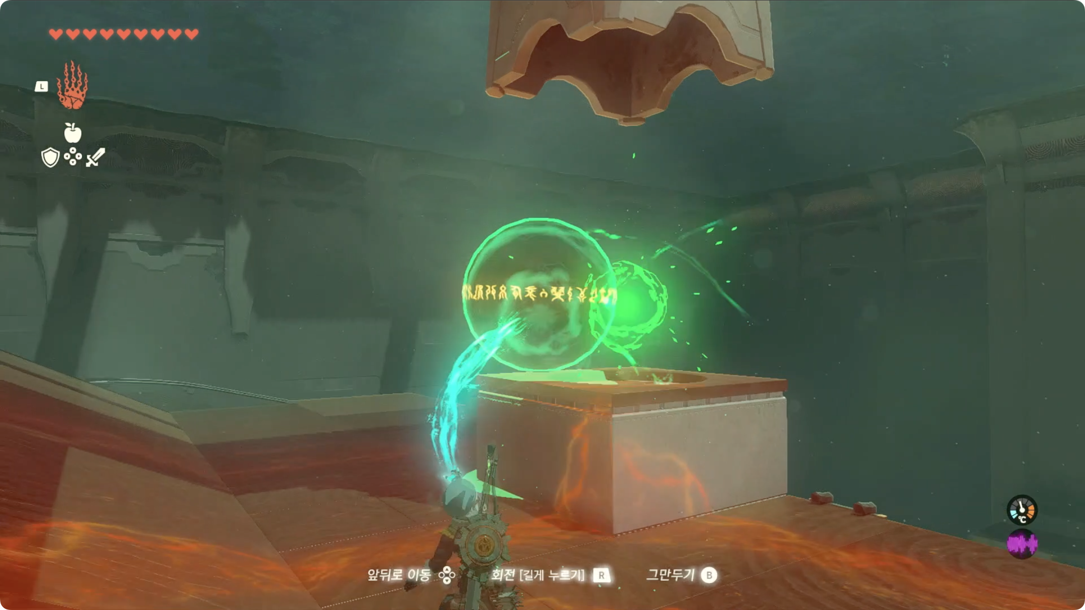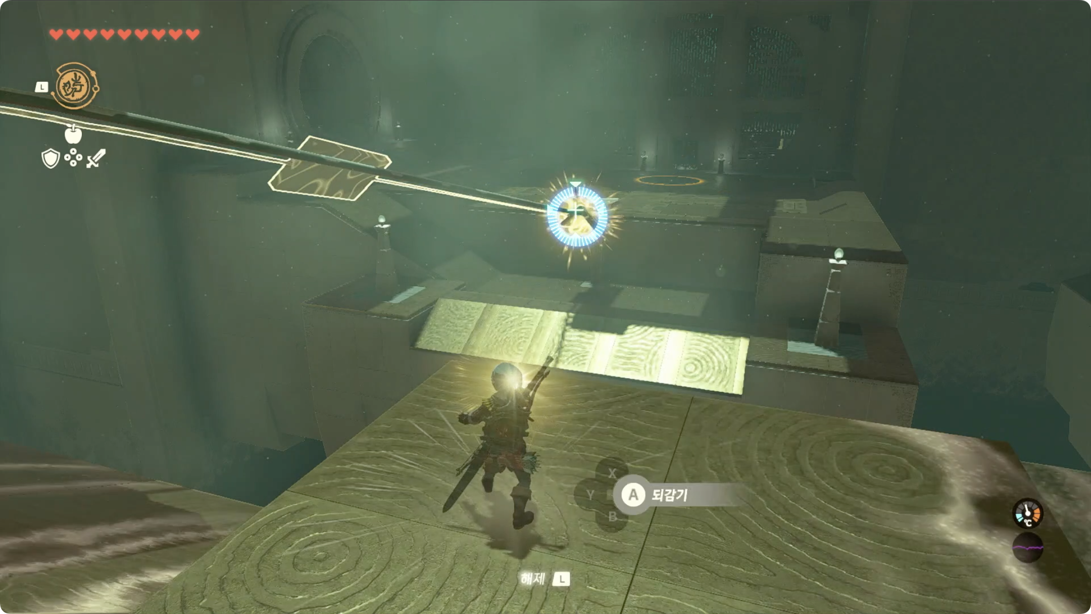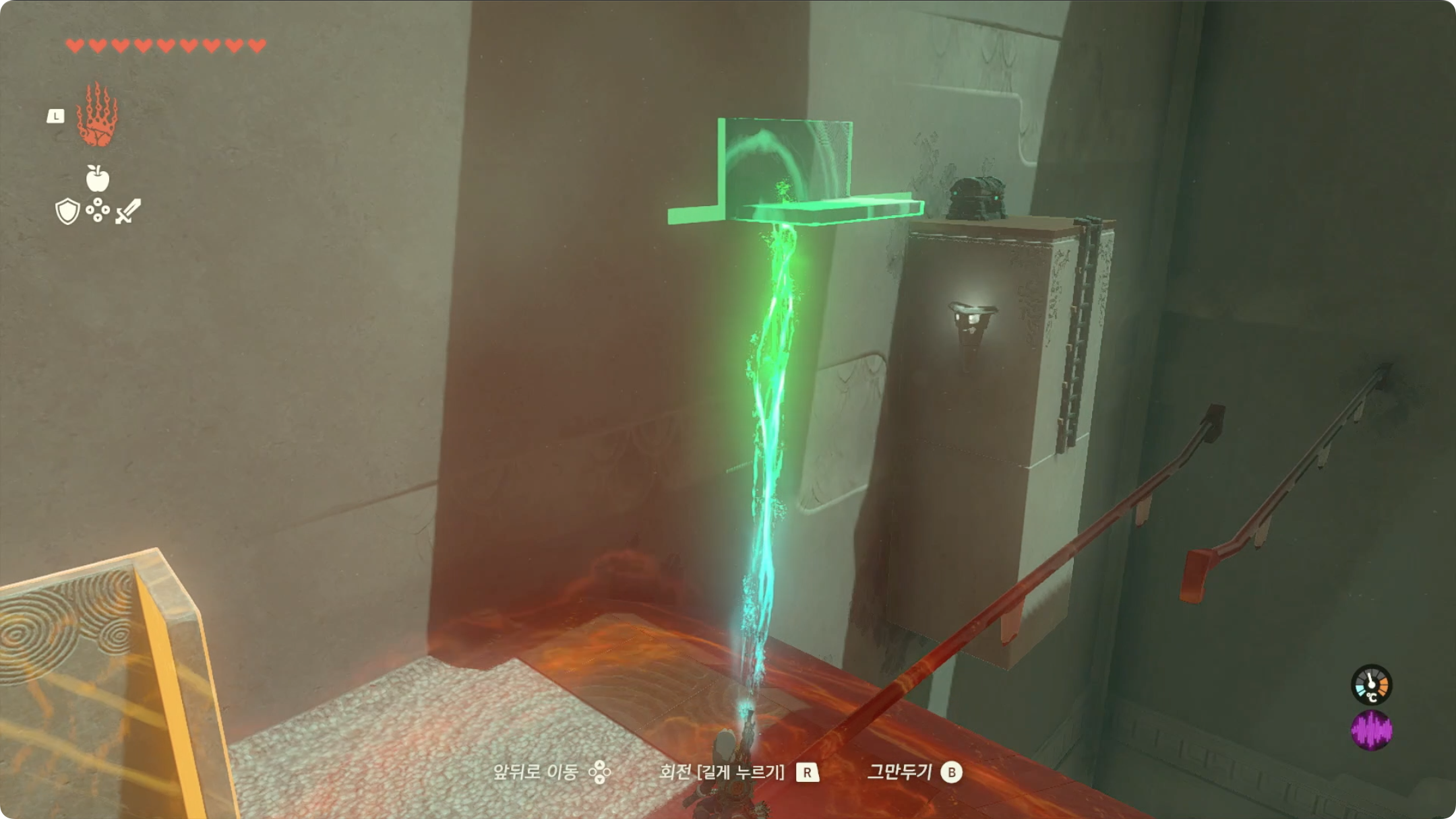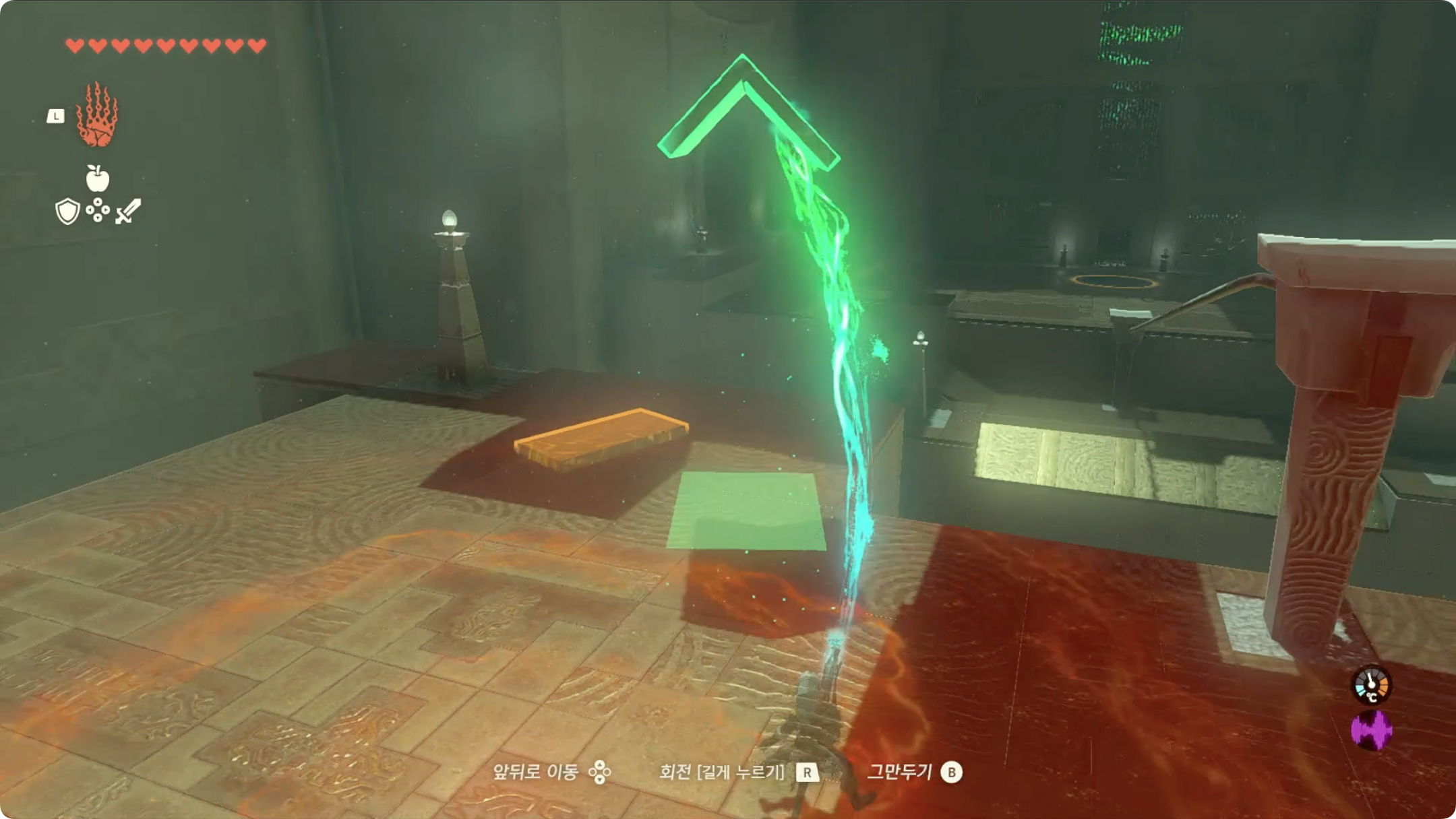 (5) 들어올렸던 블럭에 올라탄 후, 리버레코를 사용하여 보물상자가 있는곳으로 이동합니다.