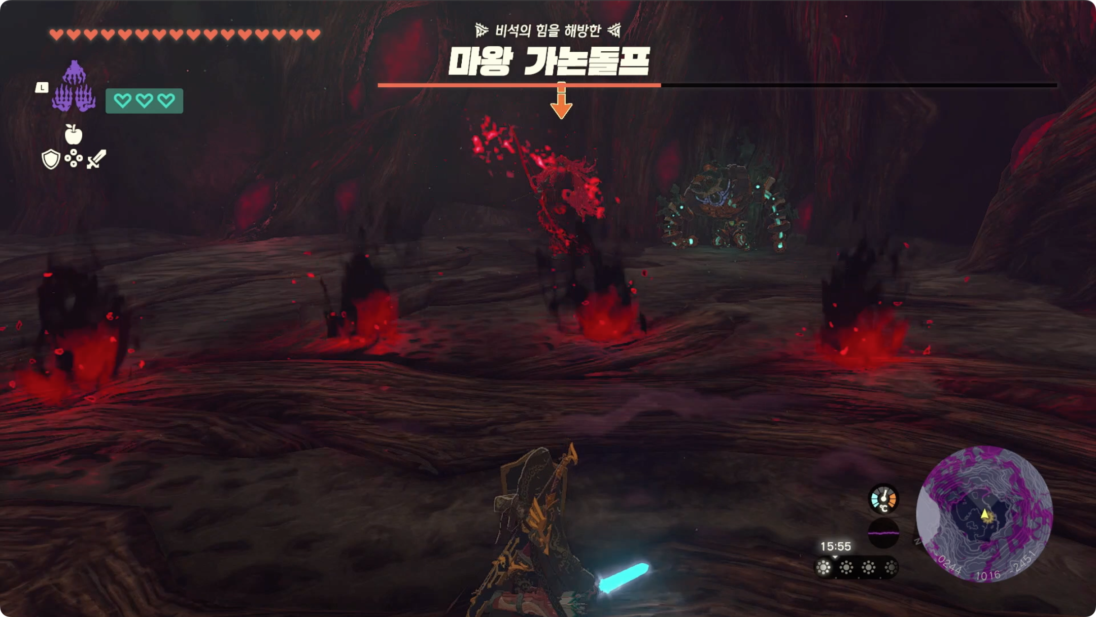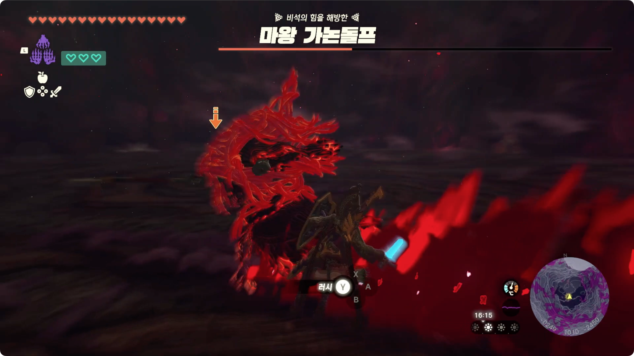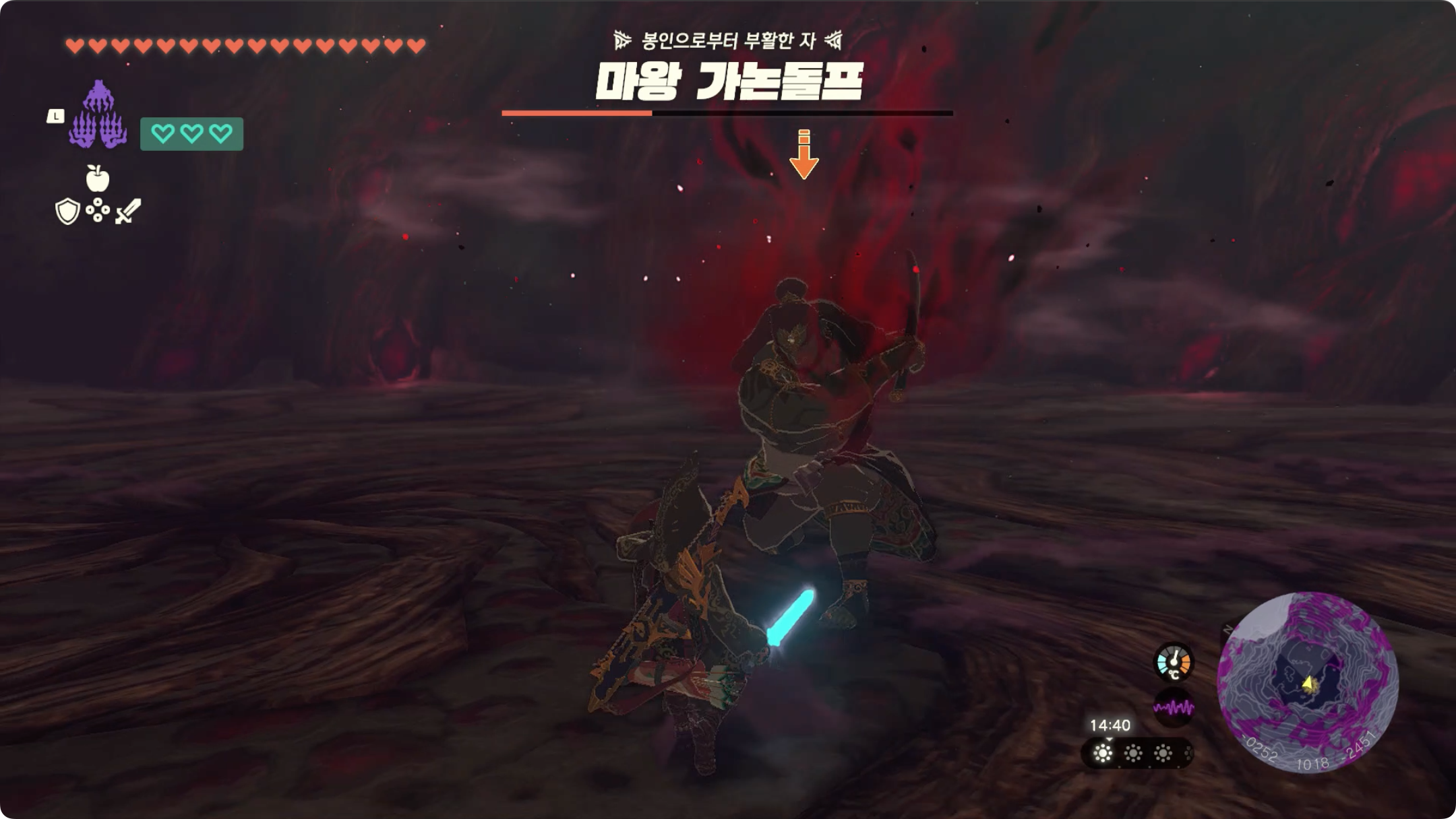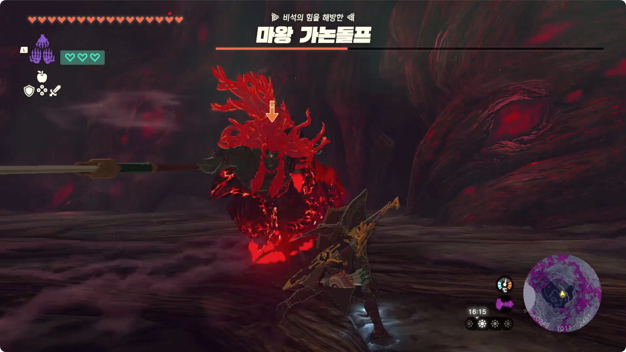 체력이 절반 이하가 되면 마왕 가논돌프와의 1:1 전투가 다시 이어집니다.