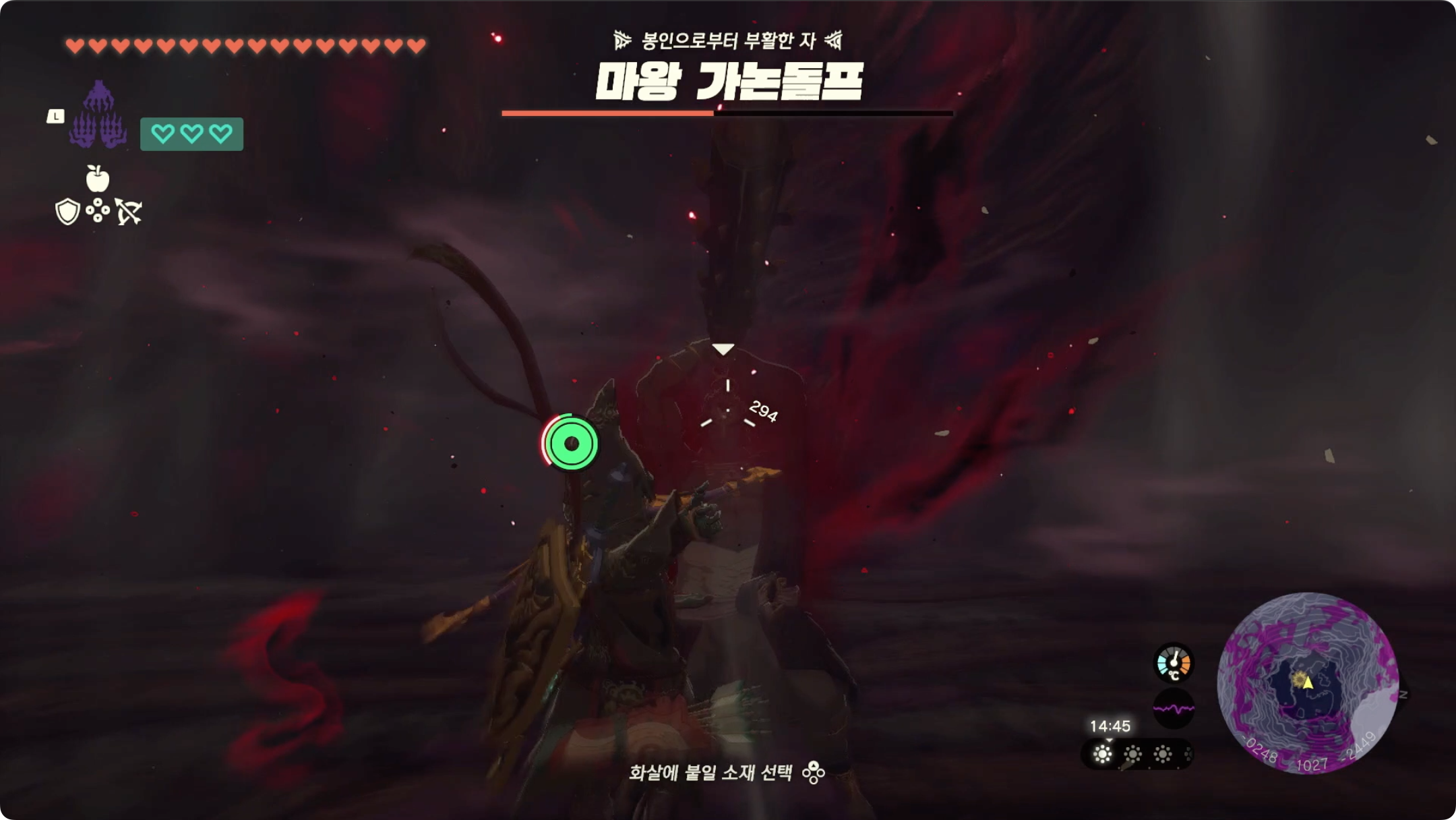 이 기술을 사용할 때 가논돌프가 활을 쥐고 있는데 바로 원거리 공격이 추가로 올 수 있으니 주의합니다.