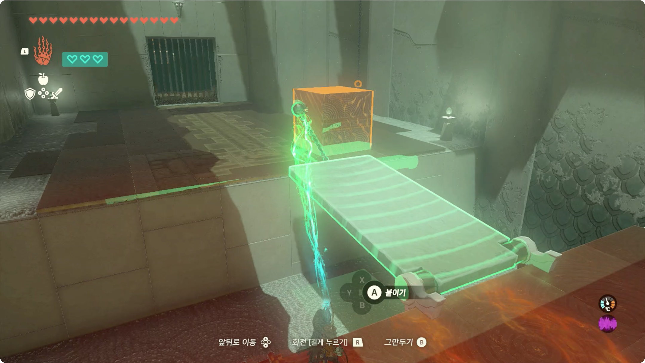(1) 바닥에 떨어져있는 구슬을 '울트라 핸드'로 건너편 상자에 붙인 후, 건너갑니다.