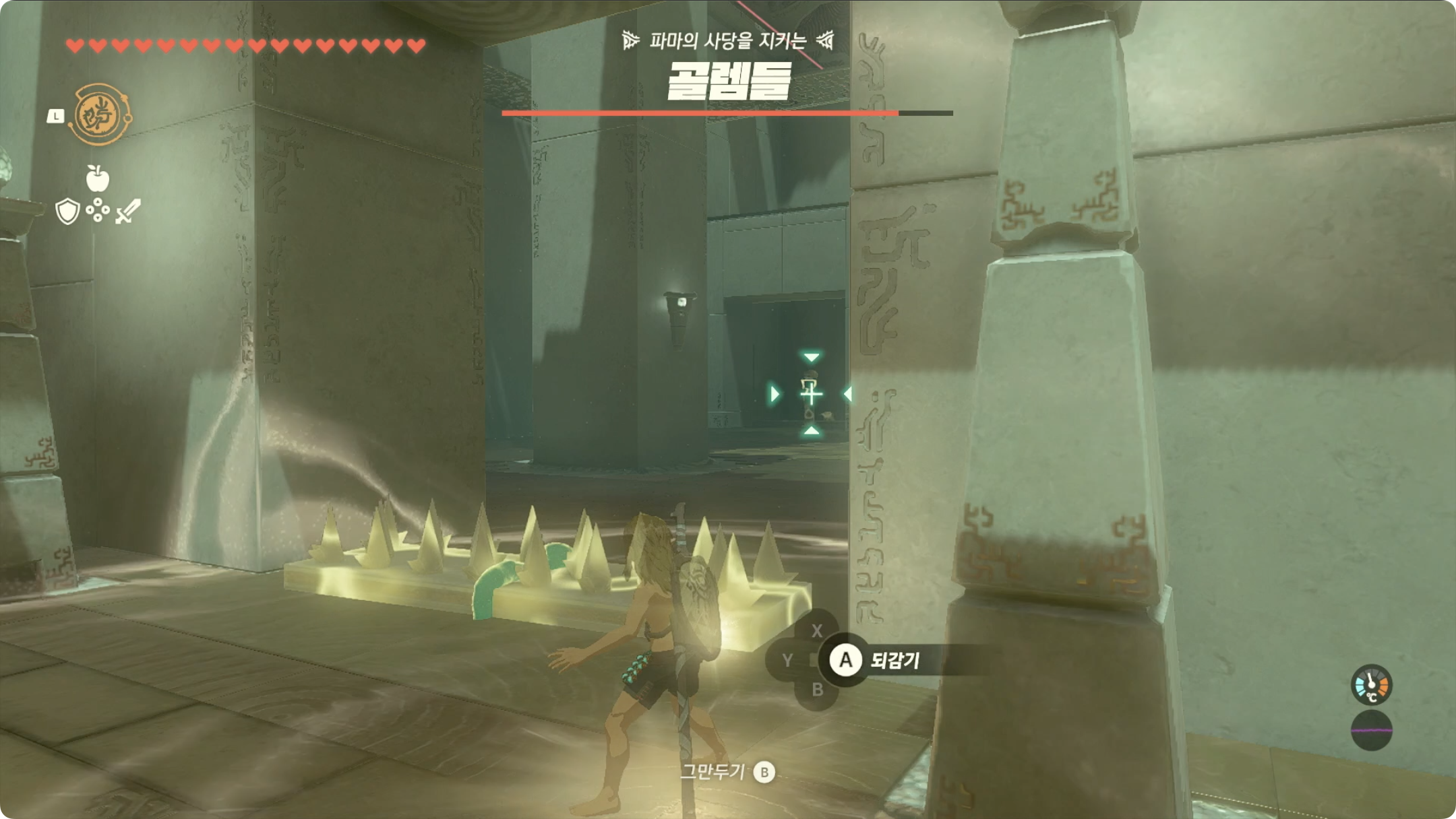 일반 공격 3방이면 쓰러트릴 수 있습니다. (주변 골렘들에게 ! 아이콘이 뜨지만 곧 잊어버리니 무시해도 됩니다)