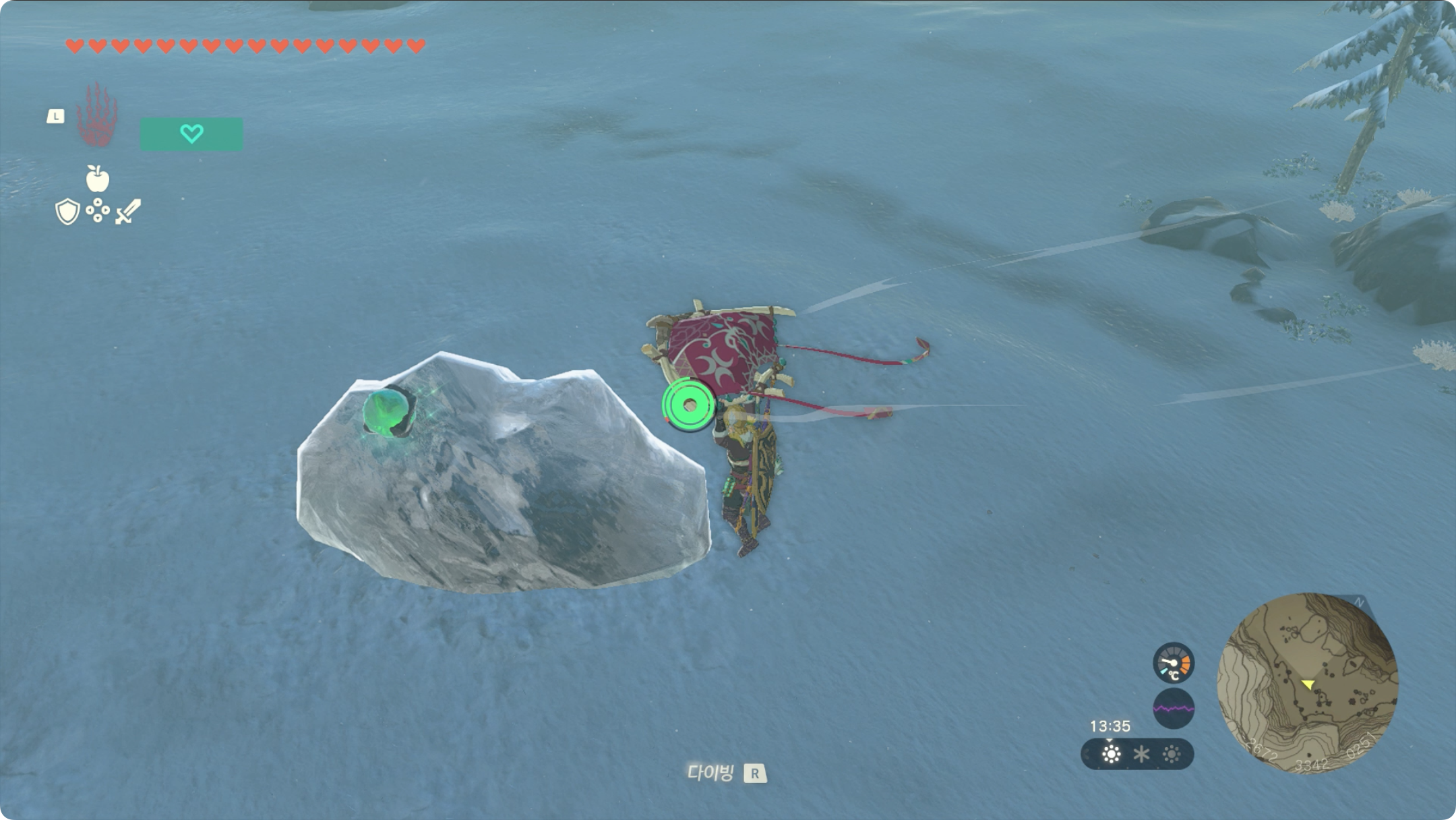 빛이 가리키는 방향으로 조금만 이동해보면 수정이 박혀있는 꽁꽁록을 발견할 수 있습니다.