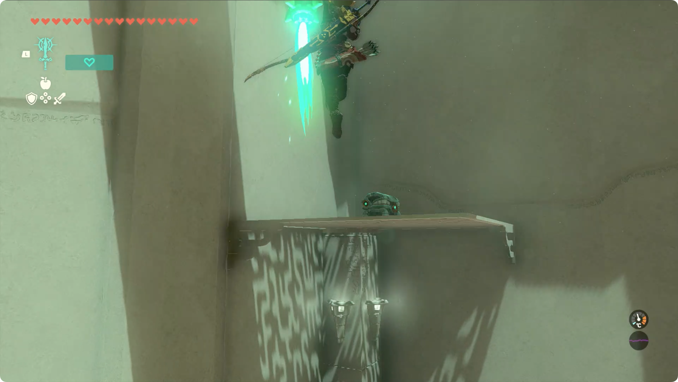 (4) 보물상자를 입수했다면 그대로 사당 출구로 패러세일을 타고 이동해도 상관없지만, 만일 내려왔다면 광차에 로켓을 달고 이동해도 되고, 다시한번 방패에 붙여 위로 올라간 후 패러세일을 타도 됩니다.
