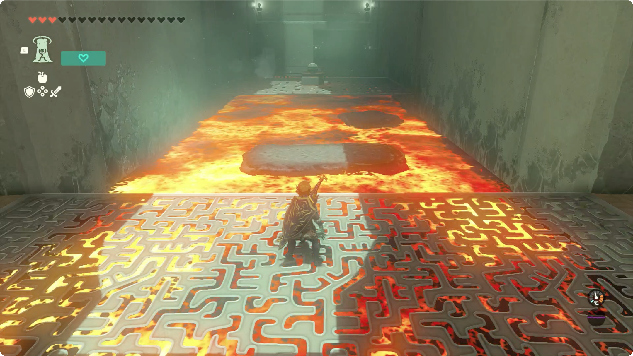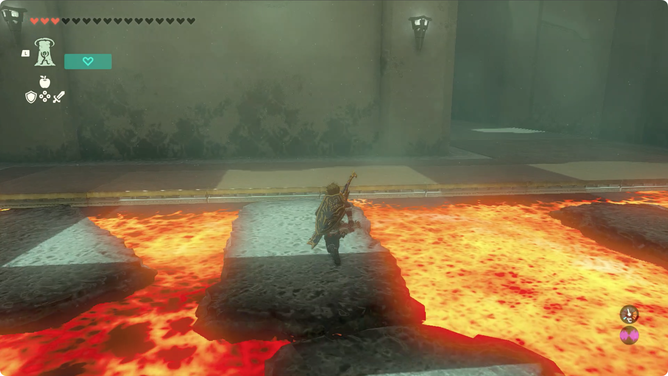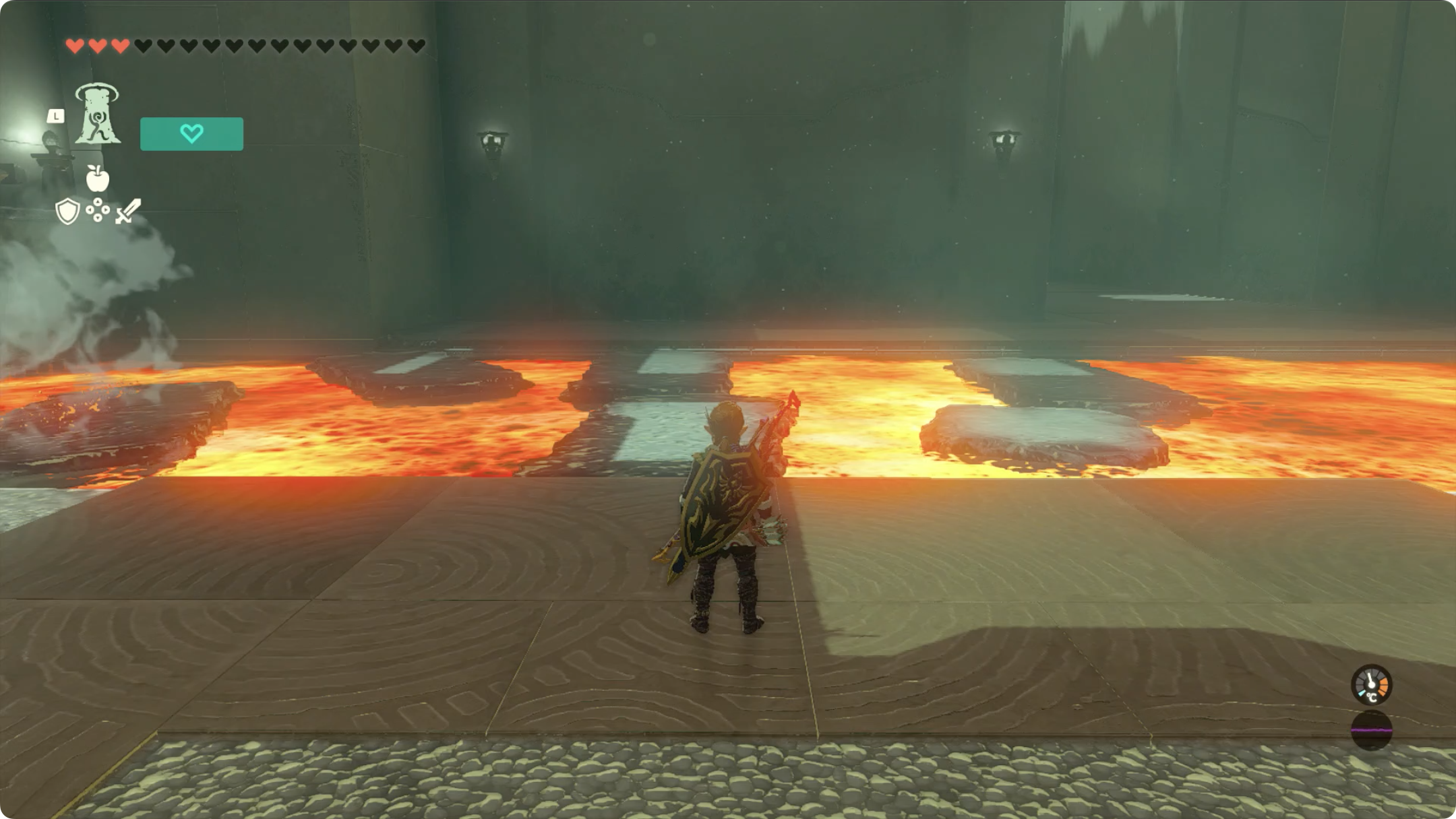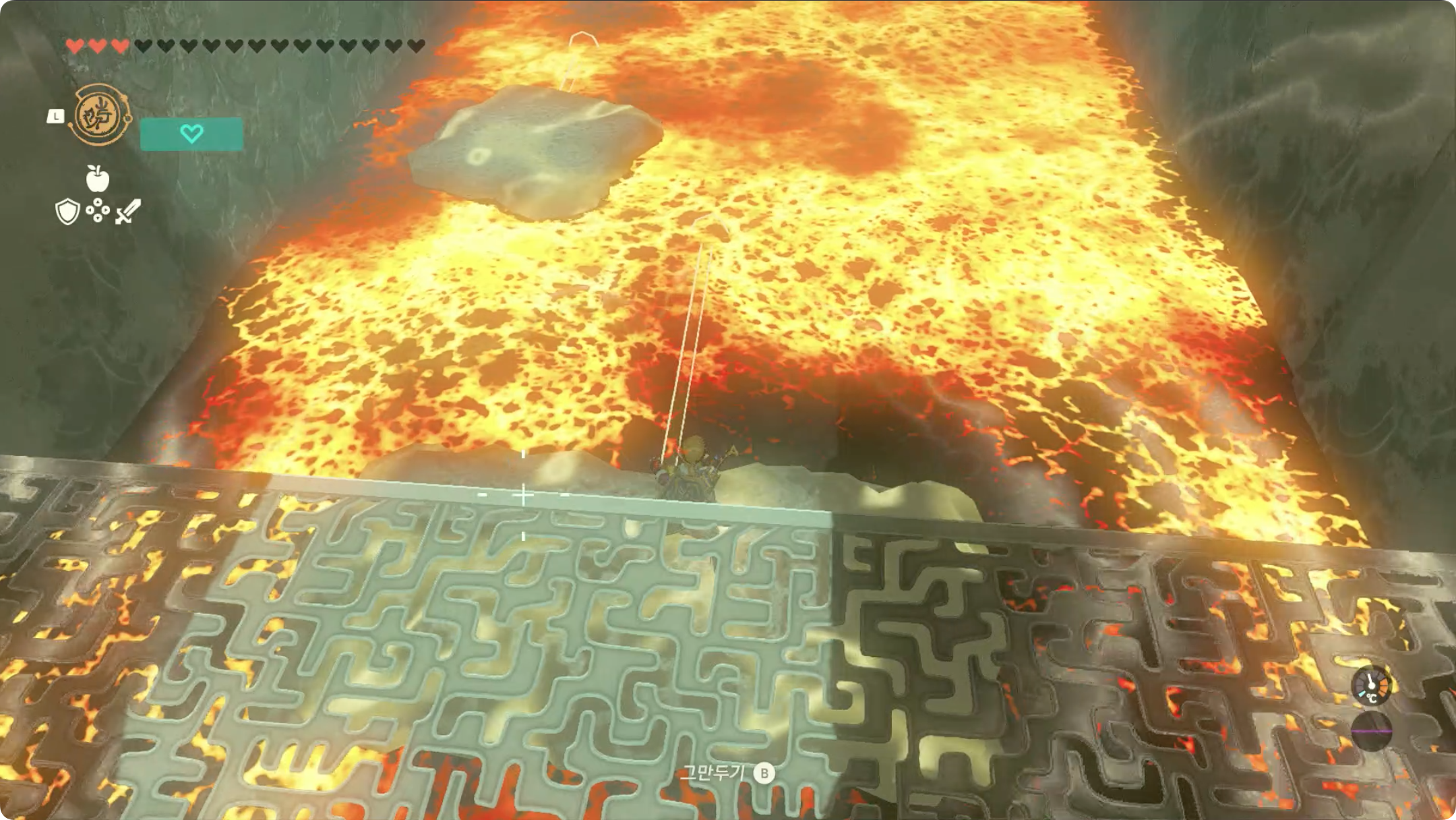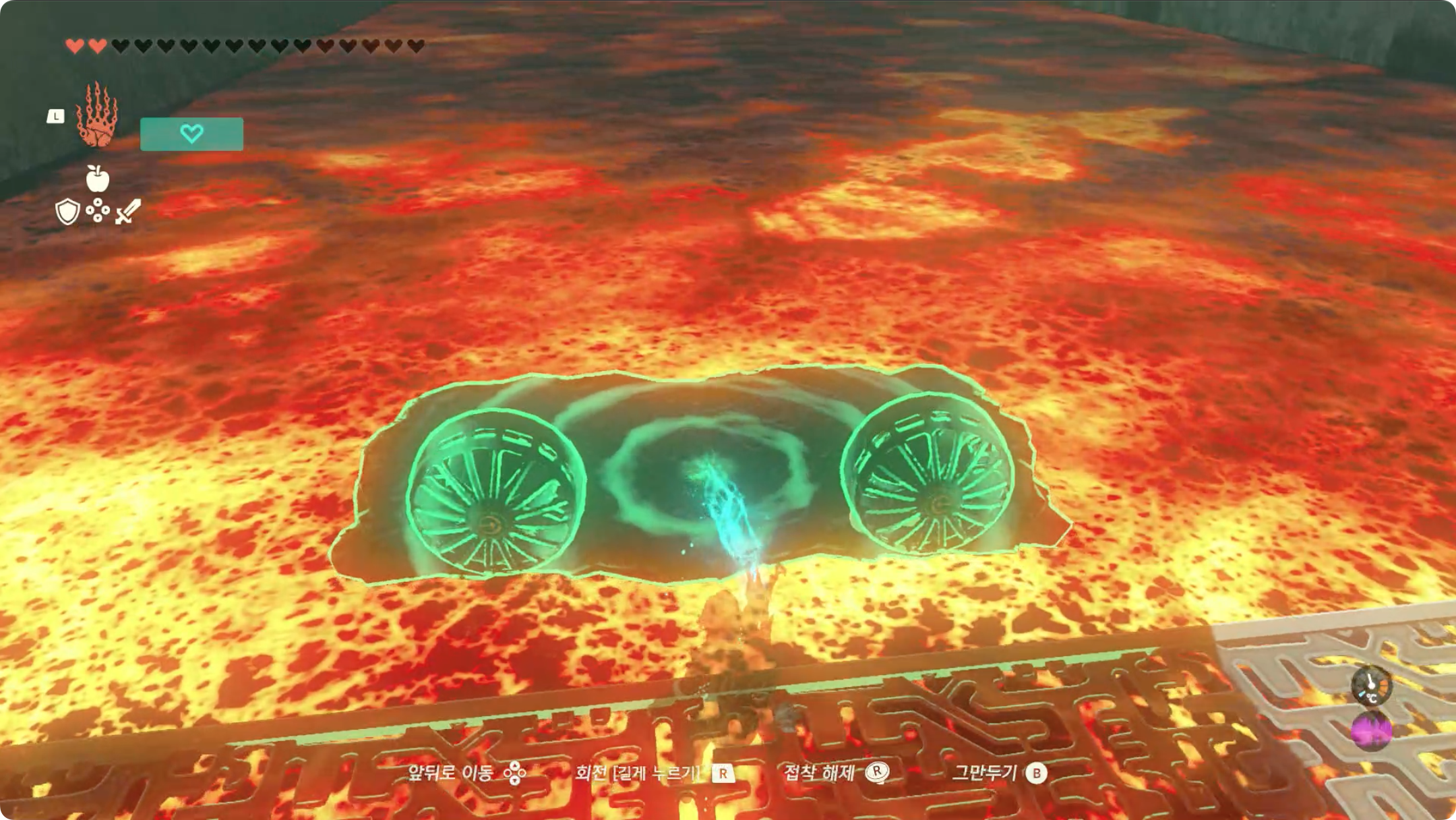 (3) 긴 발판에 올라탄 후, 리버레코를 이용해 용암을 거슬러 올라갑니다.
