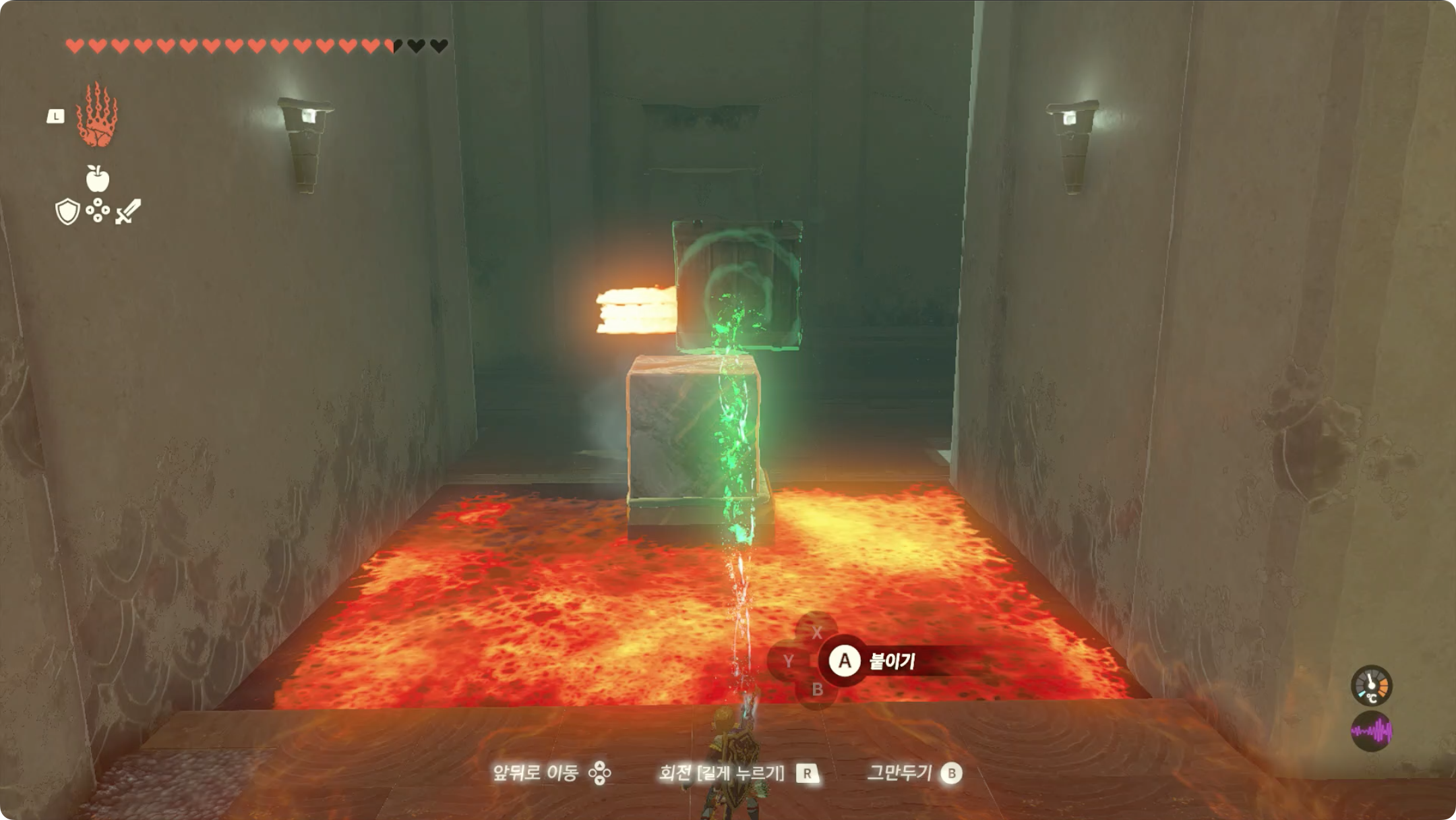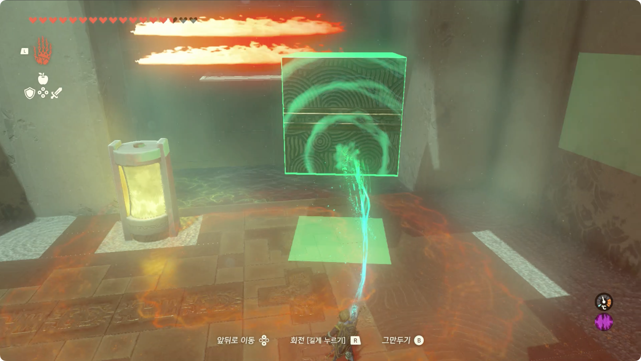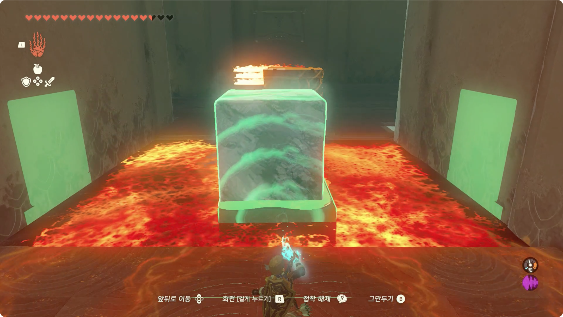 (2) 방금 건너오는데 사용한 상자를 옮겨 불이 나오는곳을 막은 후, 얼음 큐브를 빼냅니다.
