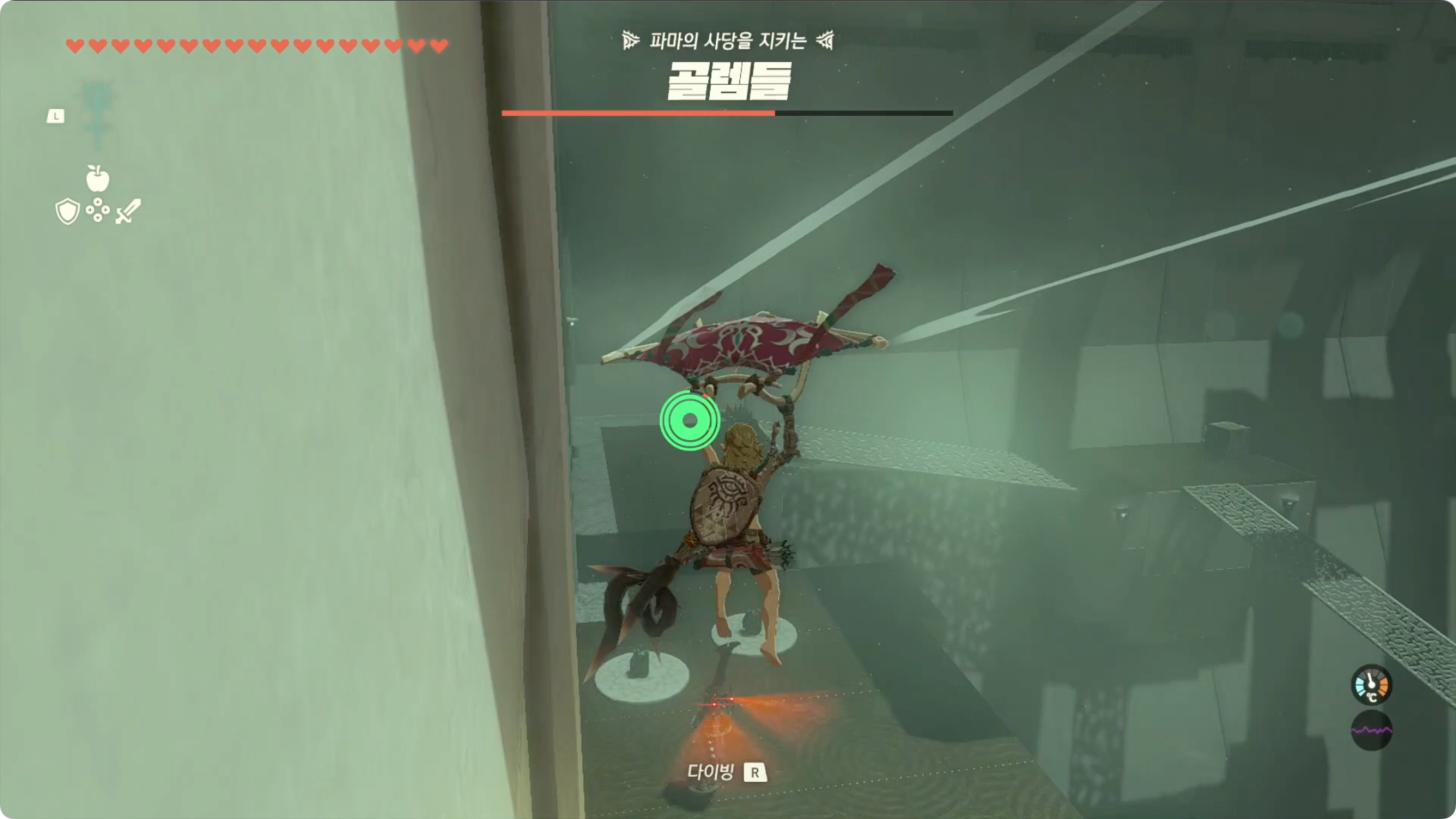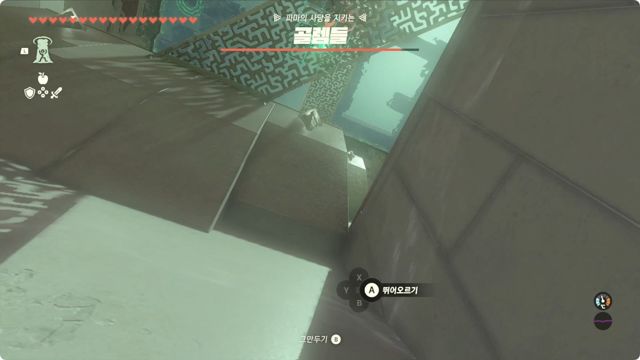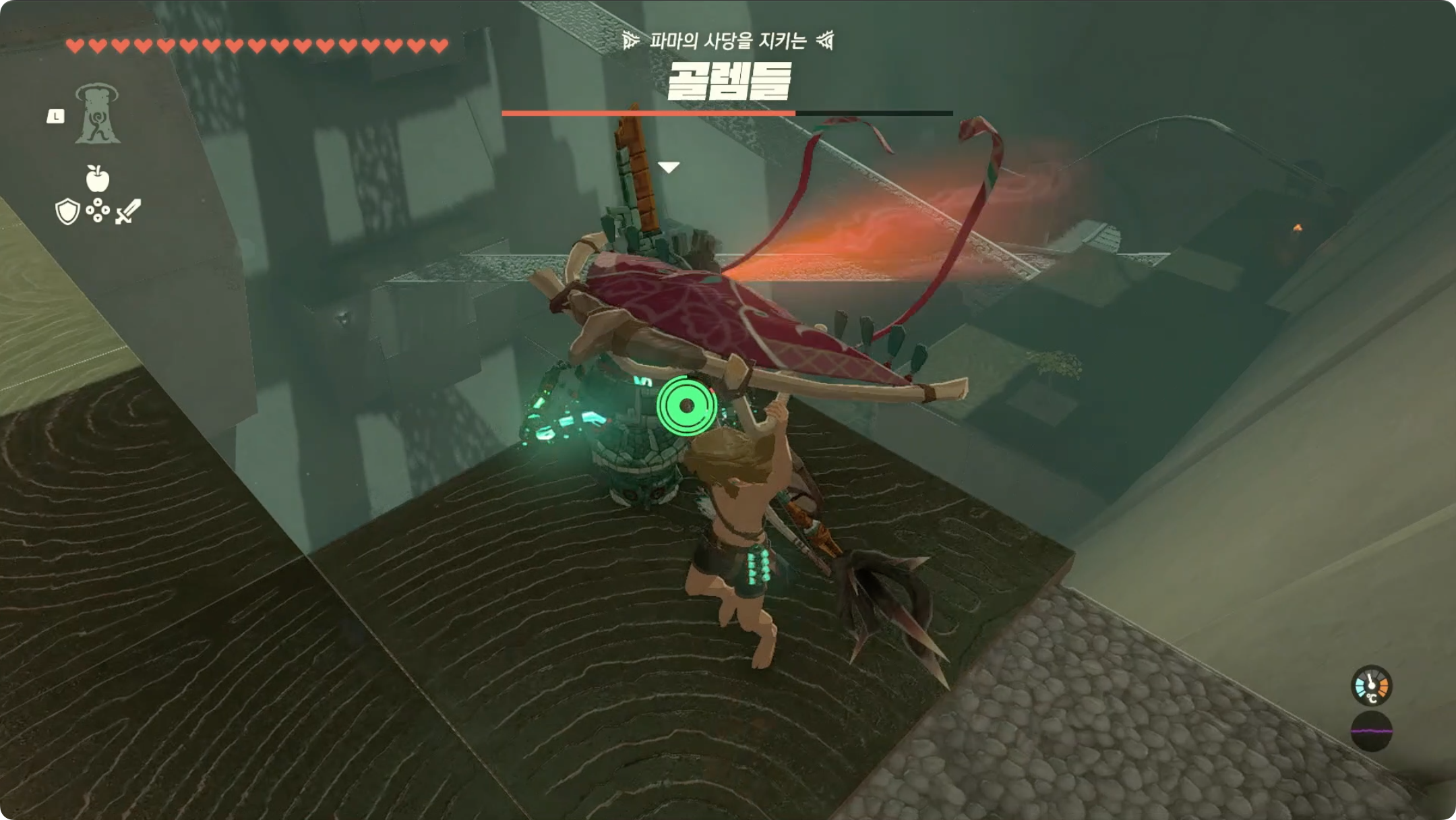 (4) 위쪽 다리위를 골렘이 오가고 있습니다. 타이밍을 맞춰 골렘 뒤로 트레루프를 이용해 올라간 후 바로 기습으로 쓰러트린 후 쓰러질때까지 때려줍시다.
