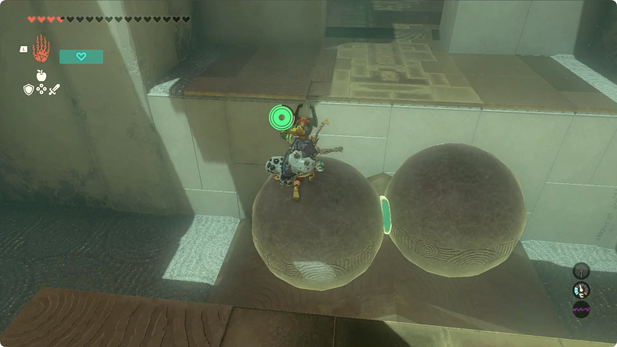 굴러떨어지지 않게 바닥 중앙에 놓아준 후, 점프를 하여 건너가면 사당 챌린지 완료입니다.