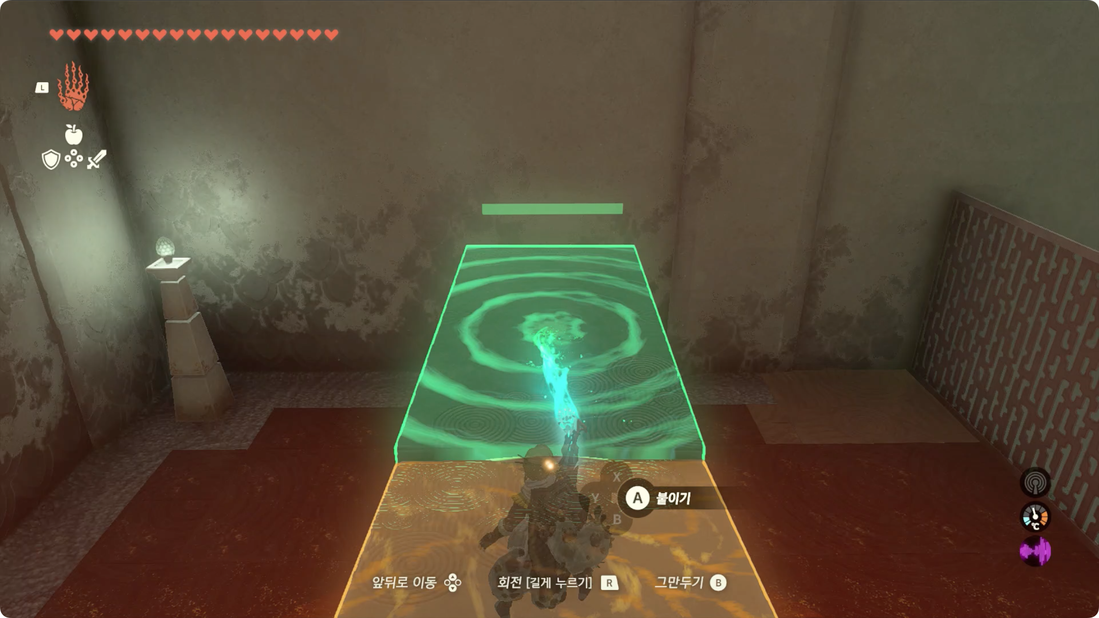 (3) 다시 톱니바퀴에 붙인 석판을 때어내서 다음으로 넘어갈 수 있는 발판을 만들고, 바닥에 있는 석판을 이용해 위로 올라갈 길을 만듭니다.