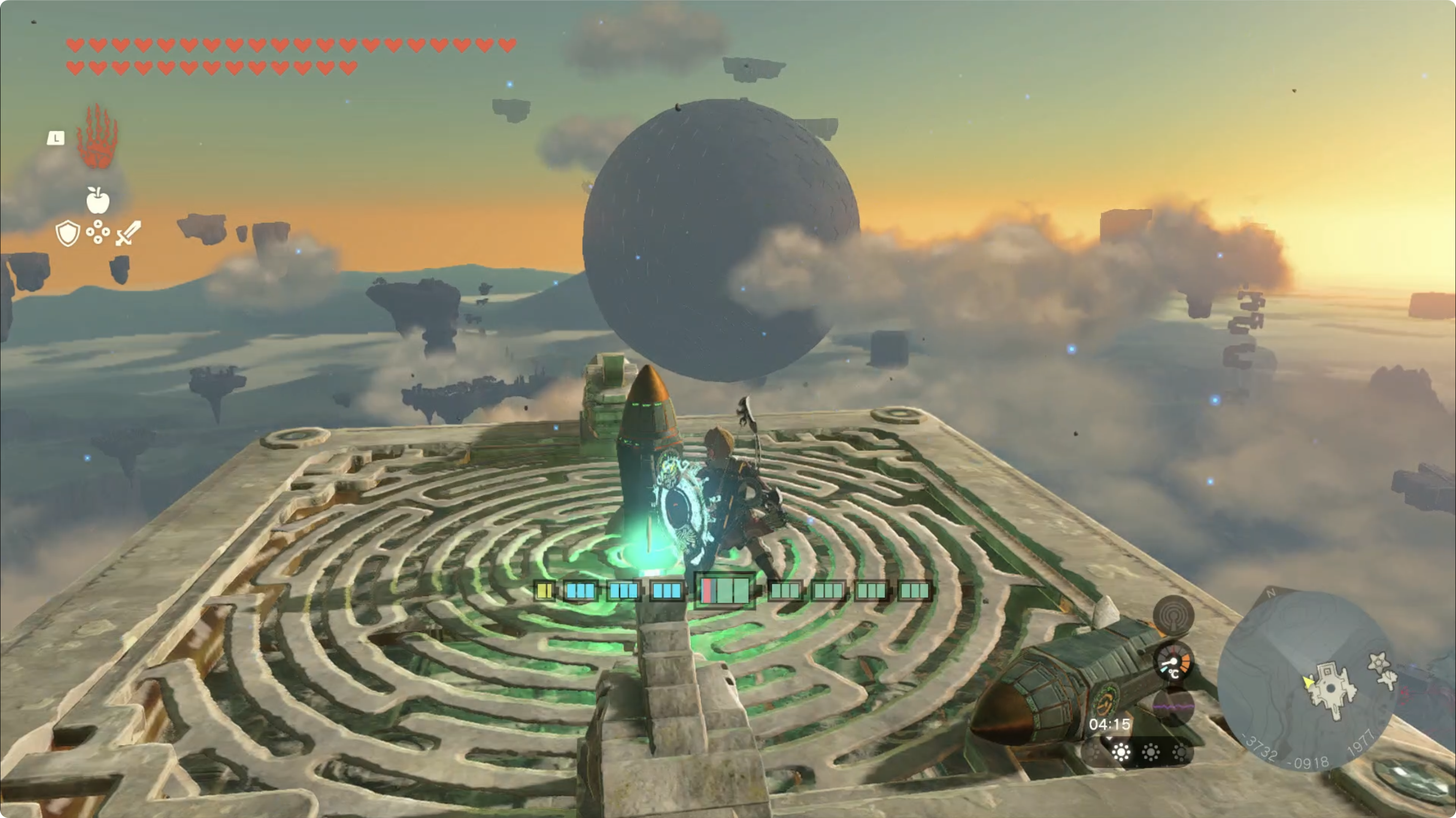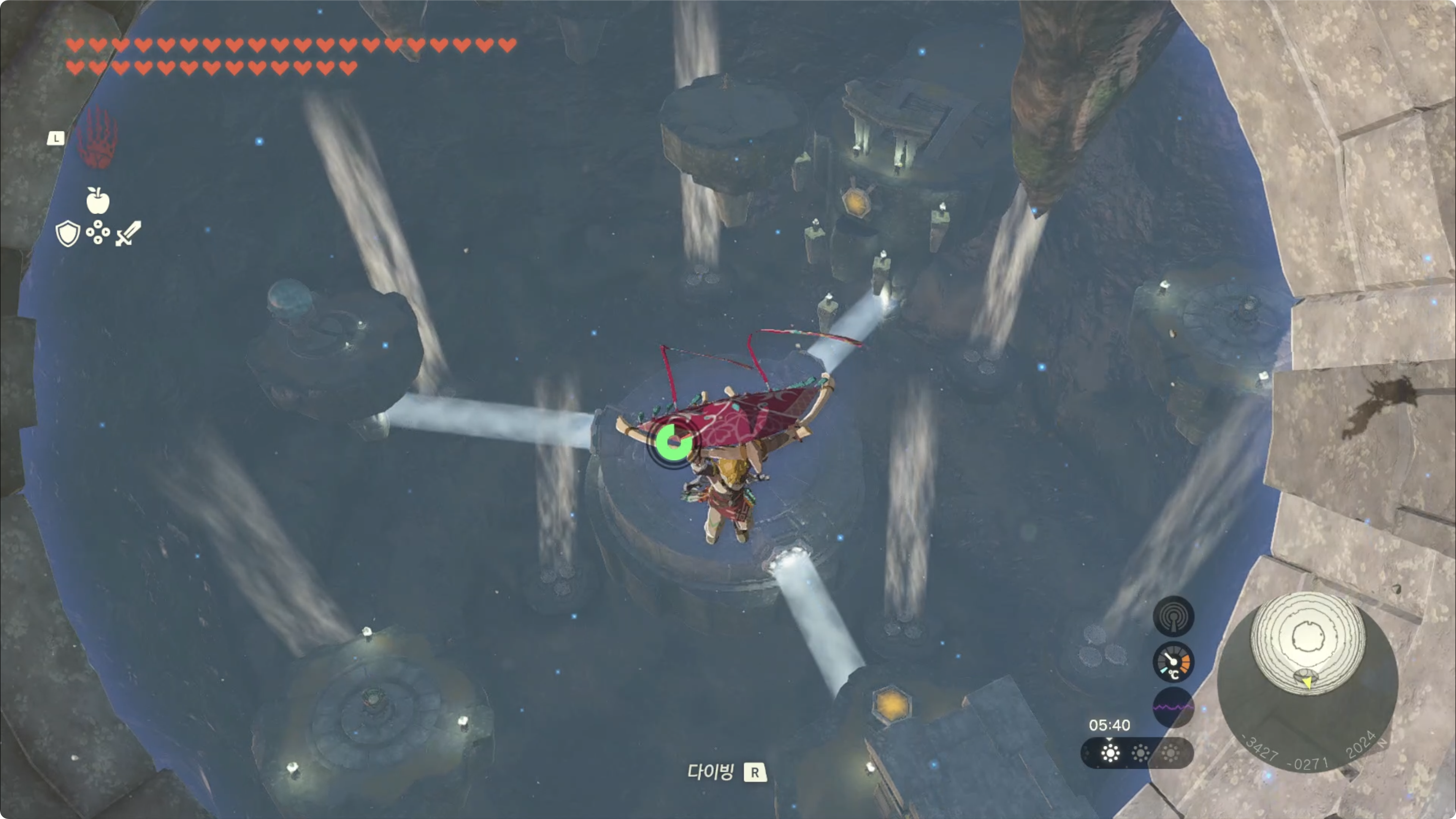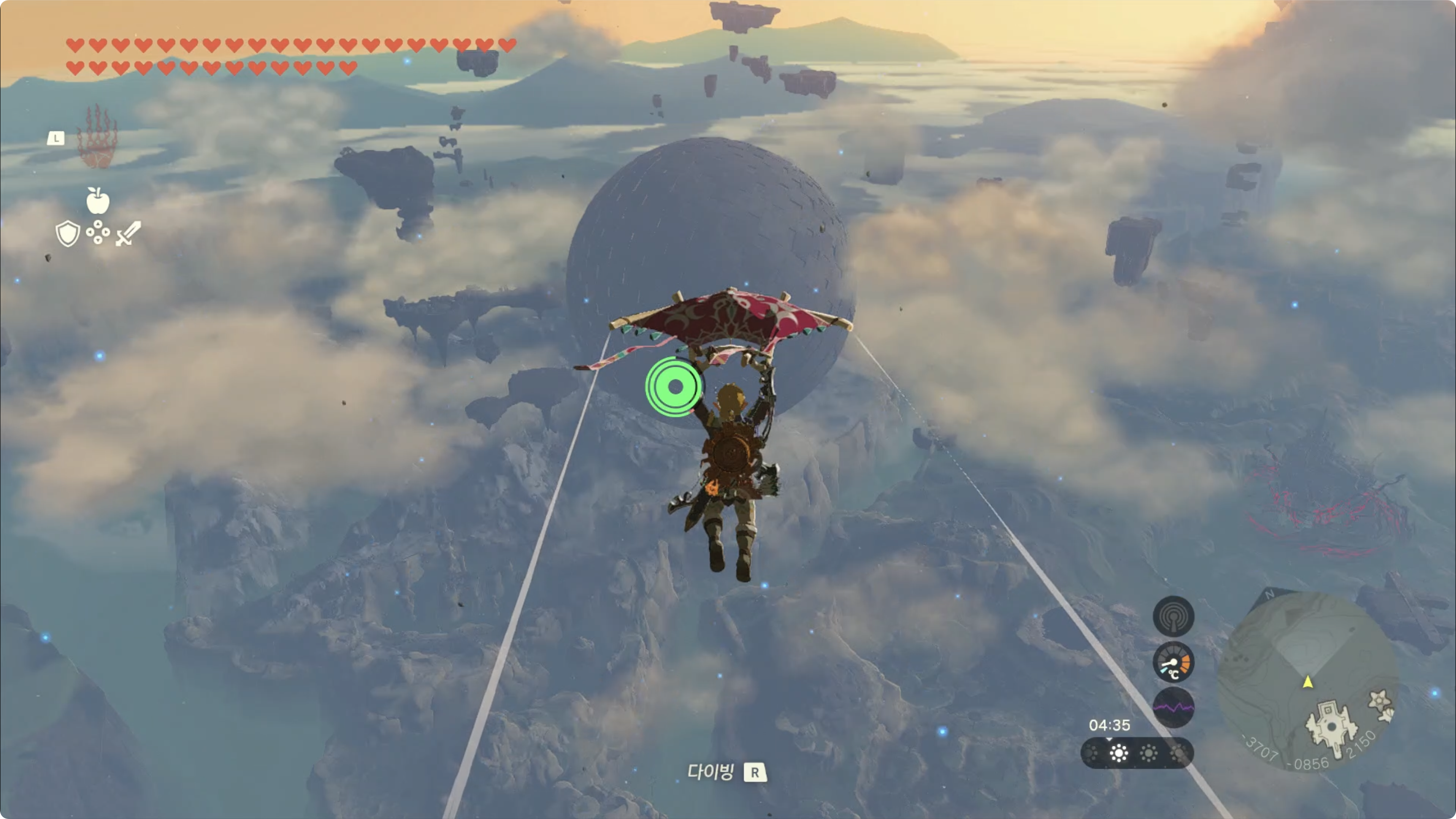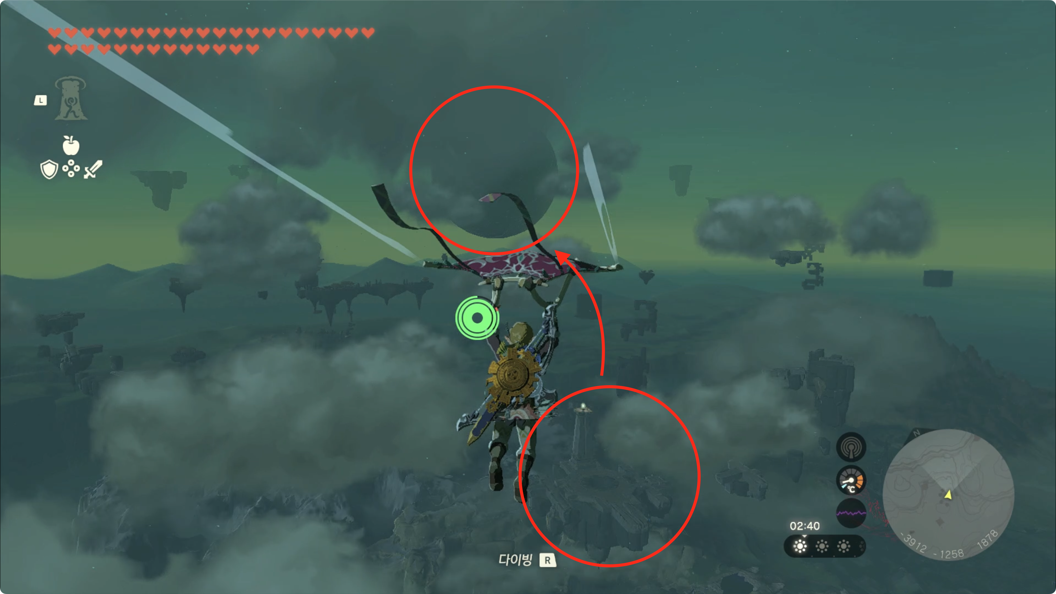 한번에 갈수는 없으니 아래쪽의 하늘섬으로 이동한 후, 부유석에 로켓을 붙여 고도를 높인 후 패러세일로 이동하면 됩니다.