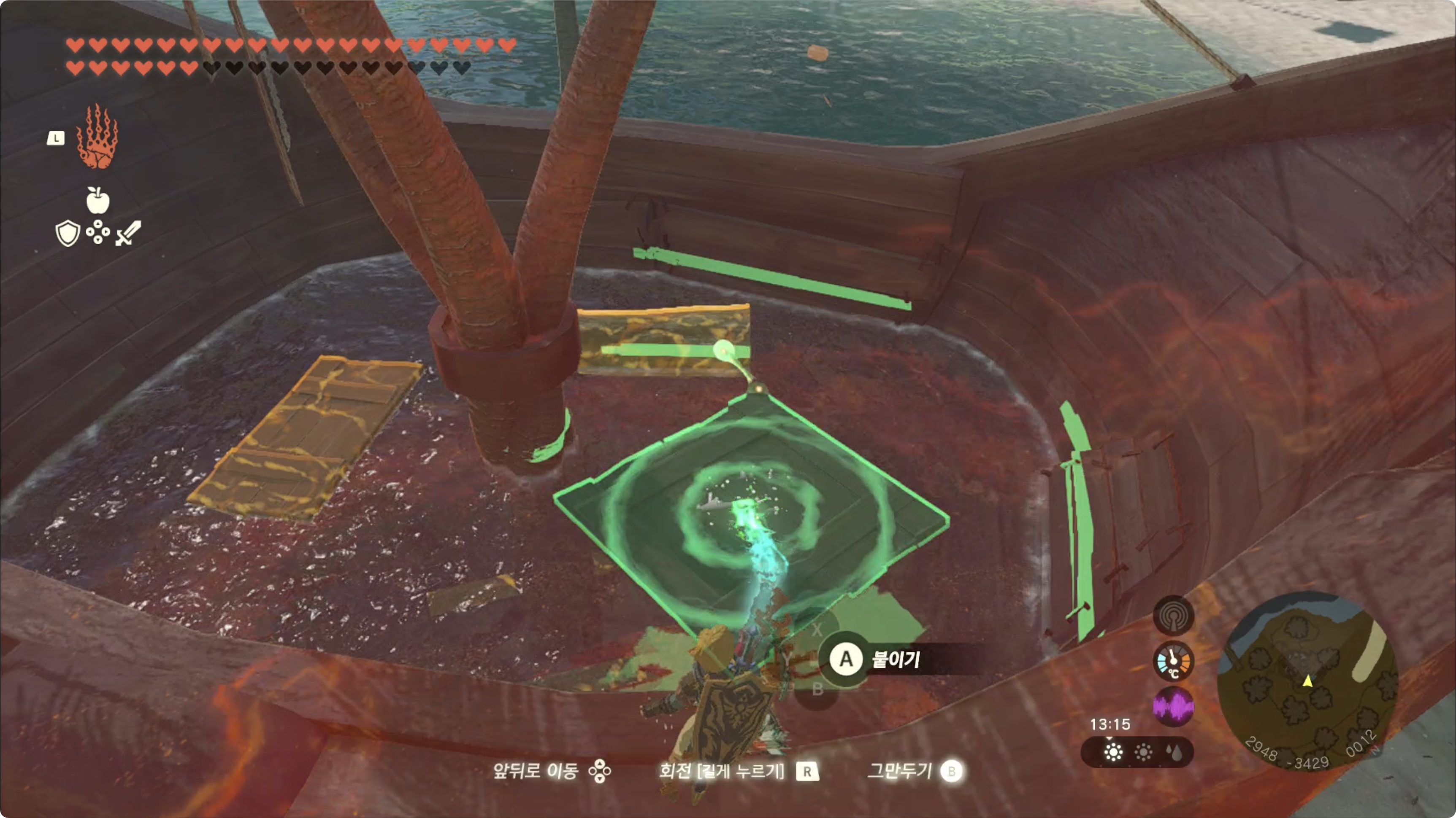 물 속에 통나무 2개가 있으니 물 속에 있는것부터 꺼내도록 하자.