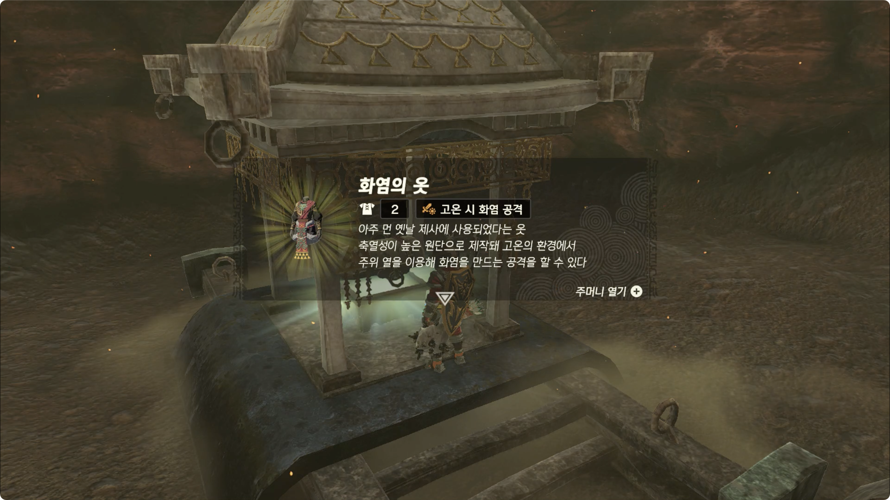 오른쪽 언덕 위로 올라가면 제단과 보물상자를 발견할 수 있으며, '화염의 옷'을 입수할 수 있습니다.