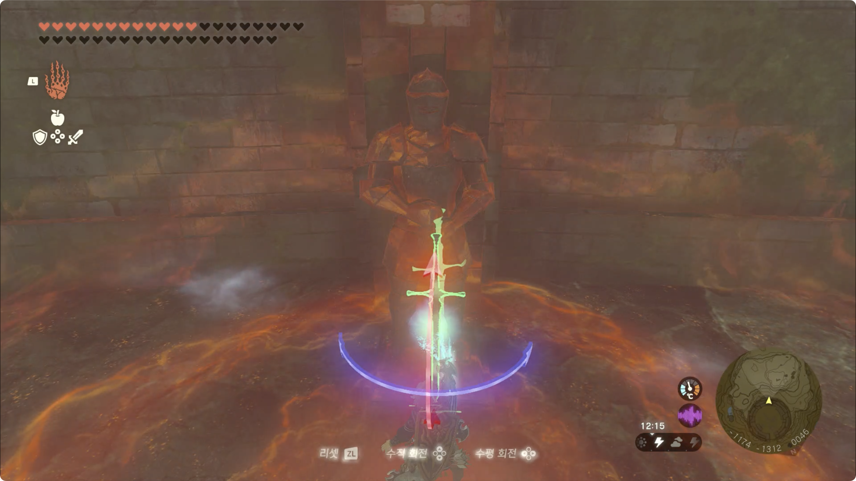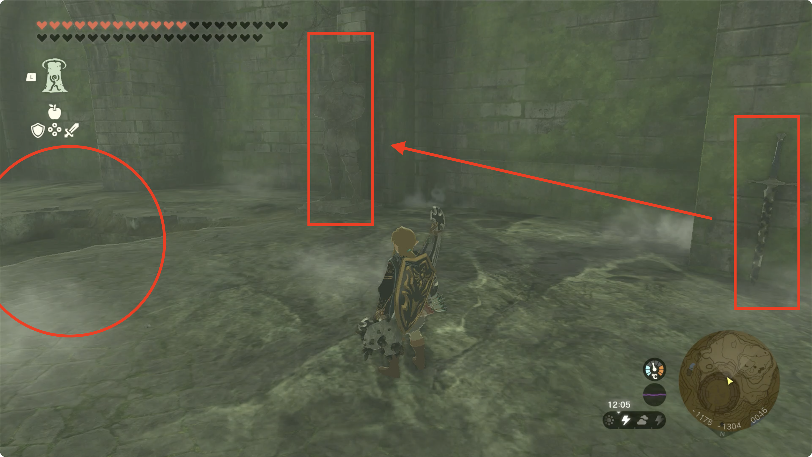 (2) 투기장 옛터의 남쪽 부근에 양손검과 석상이 있는데, 양손검을 울트라 핸드를 이용하여 석상에게 붙여주면 숨겨진 '투기장 옛터의 동굴' 문이 열립니다.