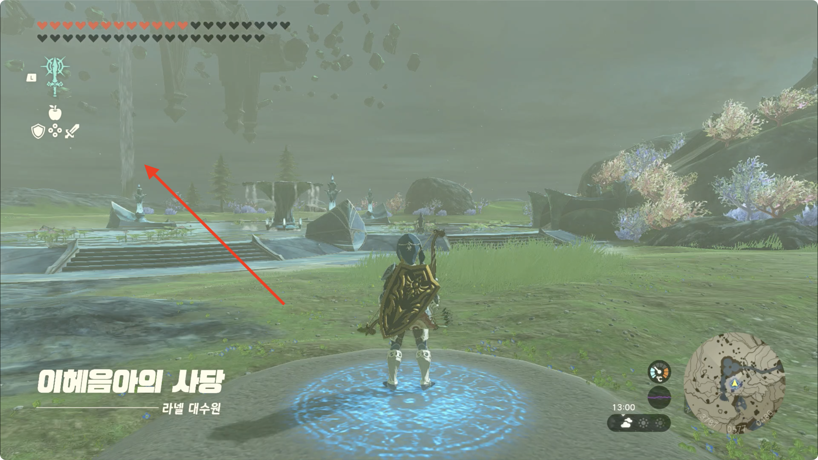 (2) 조라의 마을 동쪽에 있는 '이헤음아의 사당'으로 이동한 후, 주변을 둘러보면 폭포가 있는 하늘섬이 보입니다.
